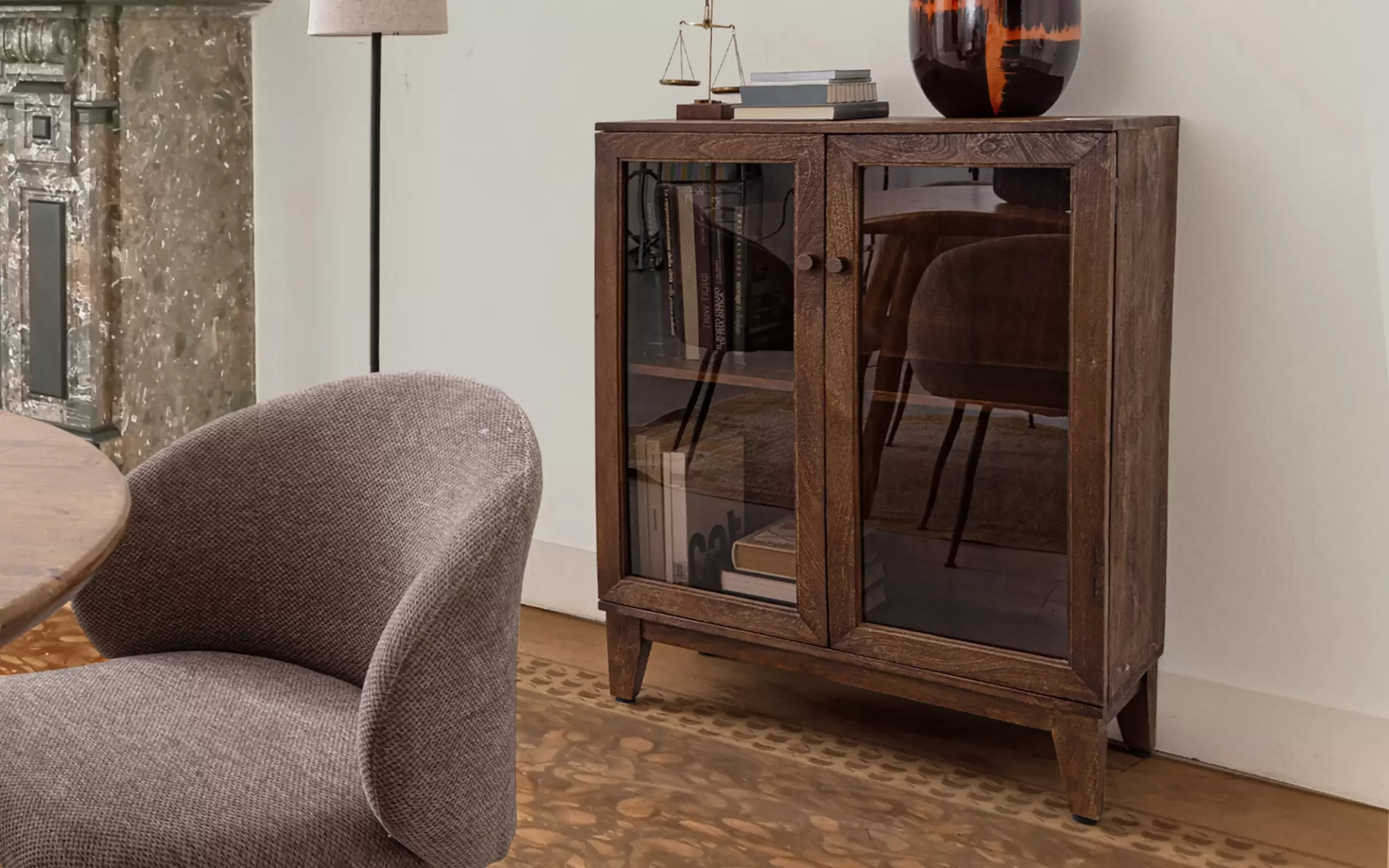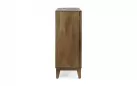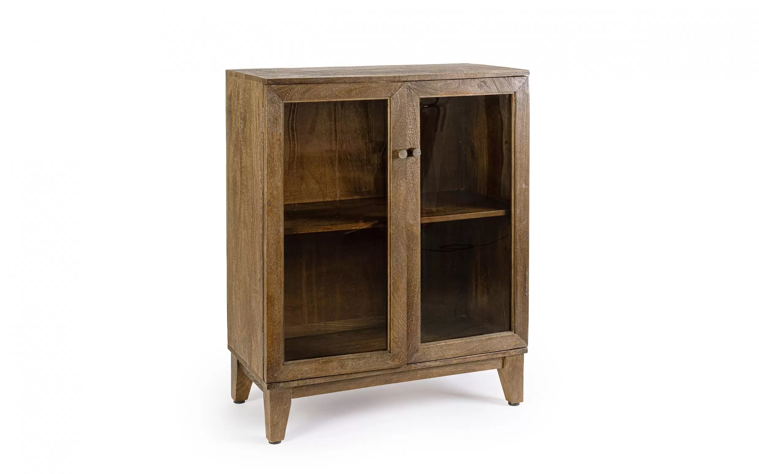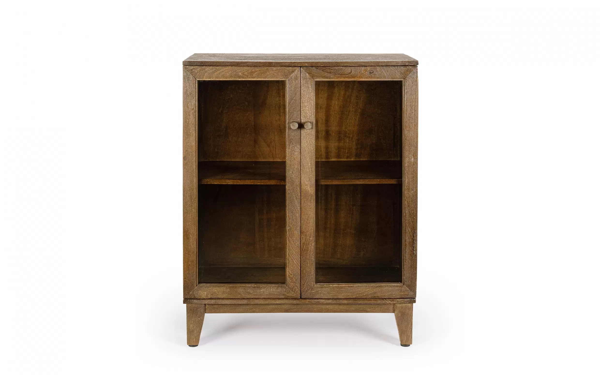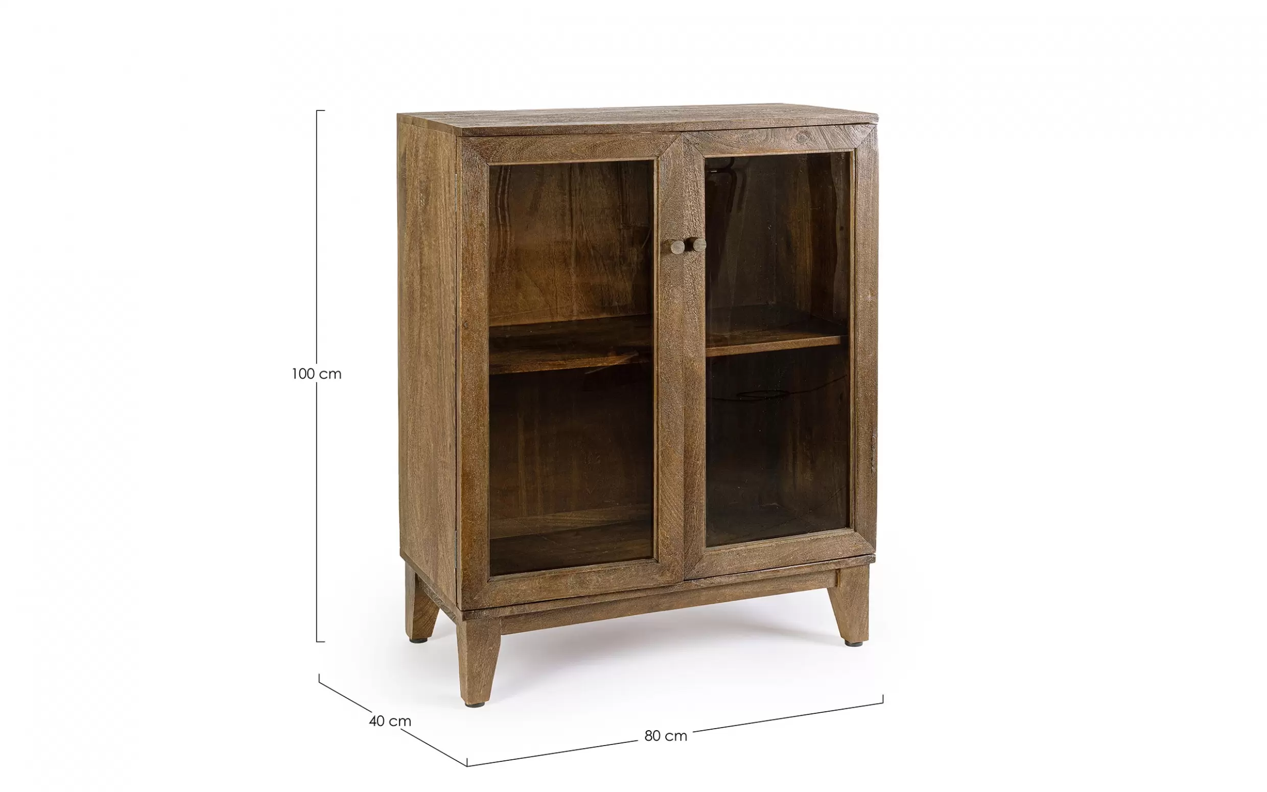 Witryna REMINGTON to wyjątkowy mebel, który łączy naturalne drewno mango z eleganckim szkłem w kolorze bursztynowym. Konstrukcja została wykończona lakierem nitrocelulozowym, który podkreśla piękno i trwałość drewna. Mebel posiada 2 drzwi ze szklanymi frontami, dzięki którym można efektownie wyeksponować dekoracje lub zastawę stołową. To stylowe połączenie klasyki i nowoczesności idealnie sprawdzi się w salonie, jadalni lub gabinecie.