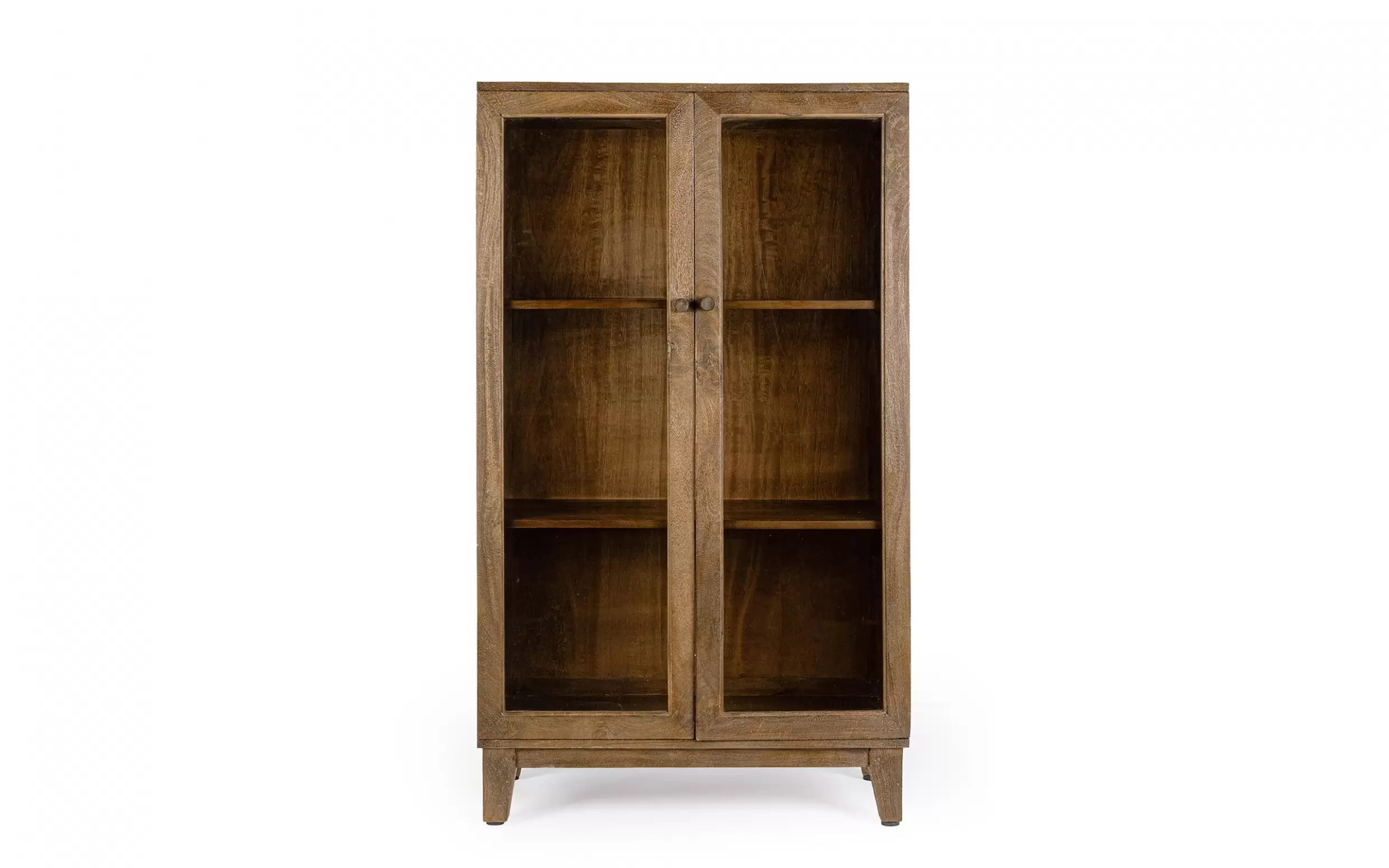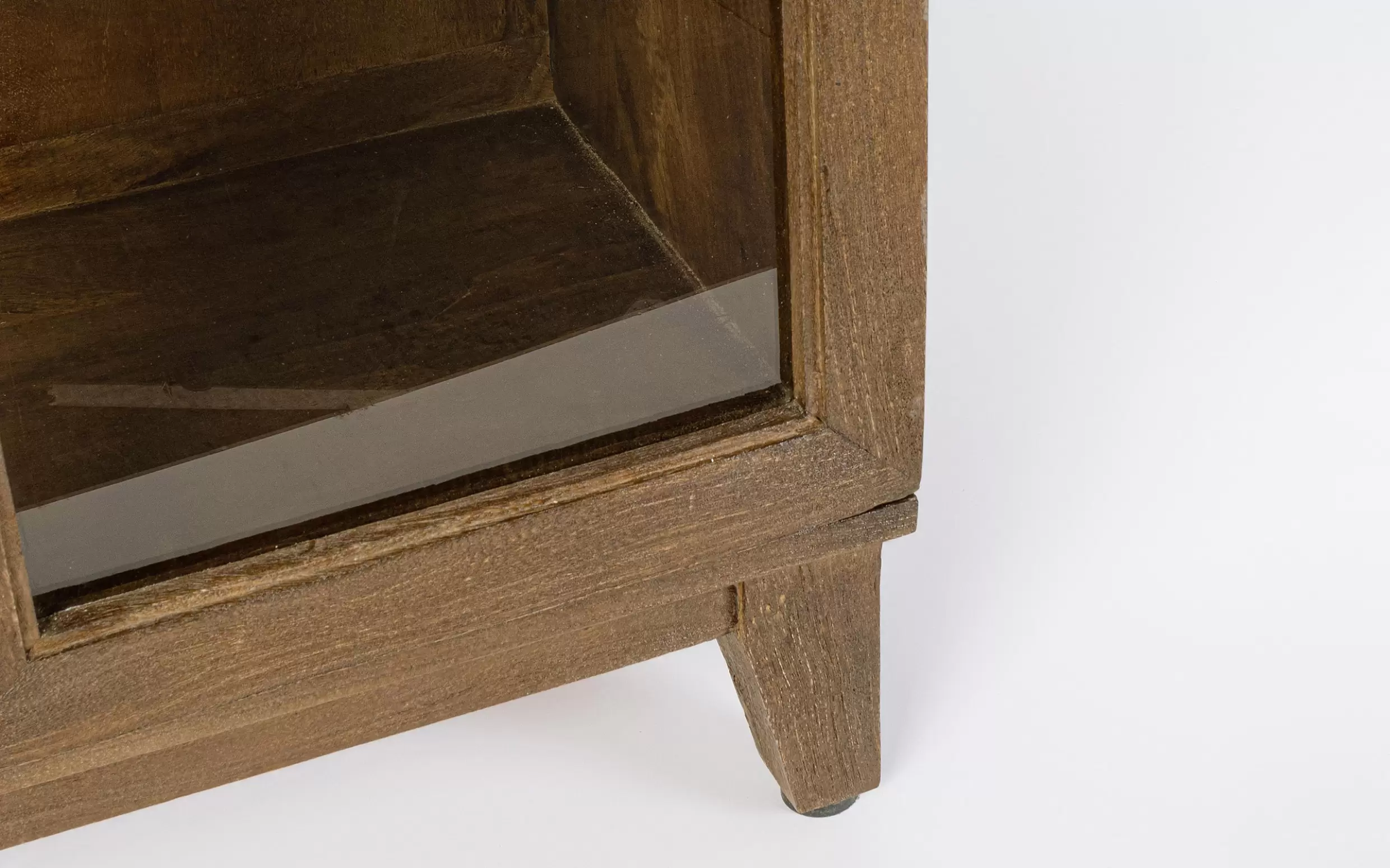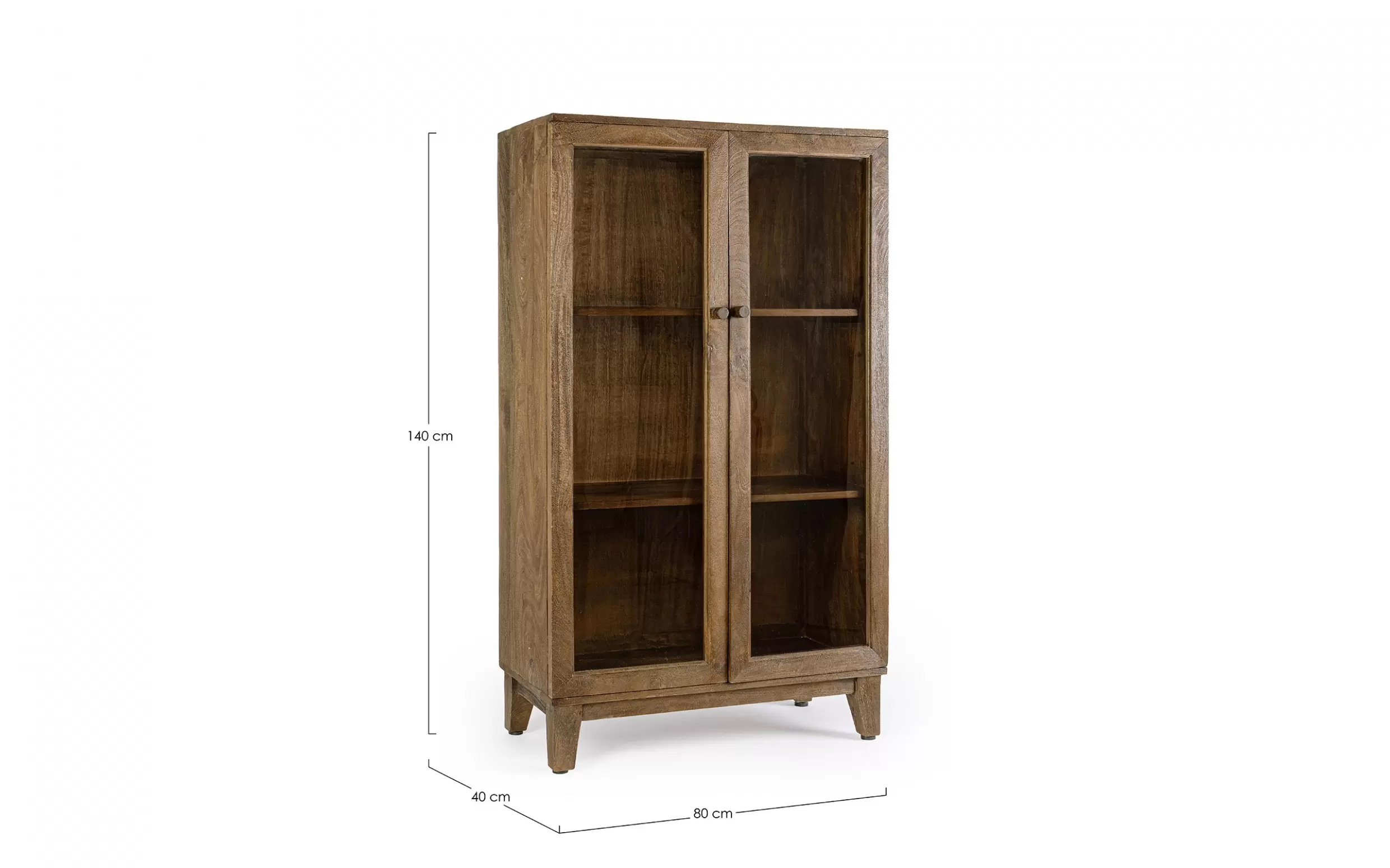 Witryna REMINGTON to stylowy mebel, który łączy naturalne drewno mango z eleganckim szkłem w bursztynowym odcieniu. Konstrukcja została wykończona lakierem nitrocelulozowym, co podkreśla piękno drewna i zwiększa jego trwałość. Wyposażona w 2 drzwi z przeszklonymi frontami, świetnie sprawdzi się jako miejsce do przechowywania i ekspozycji porcelany, szkła lub dekoracji. Jej wysokość 140 cm czyni ją idealnym kompromisem między niską a wysoką witryną.