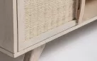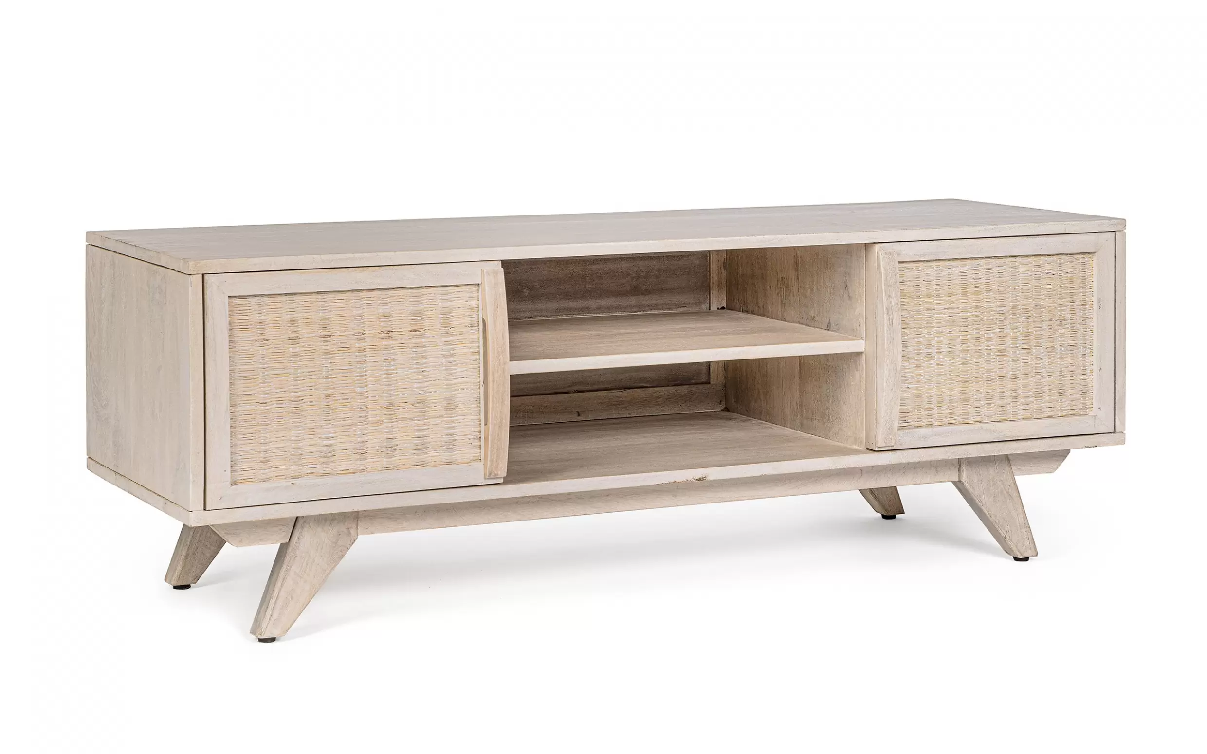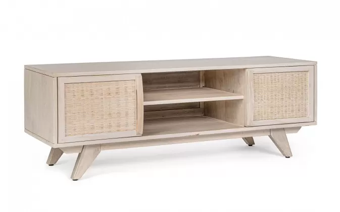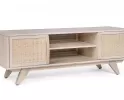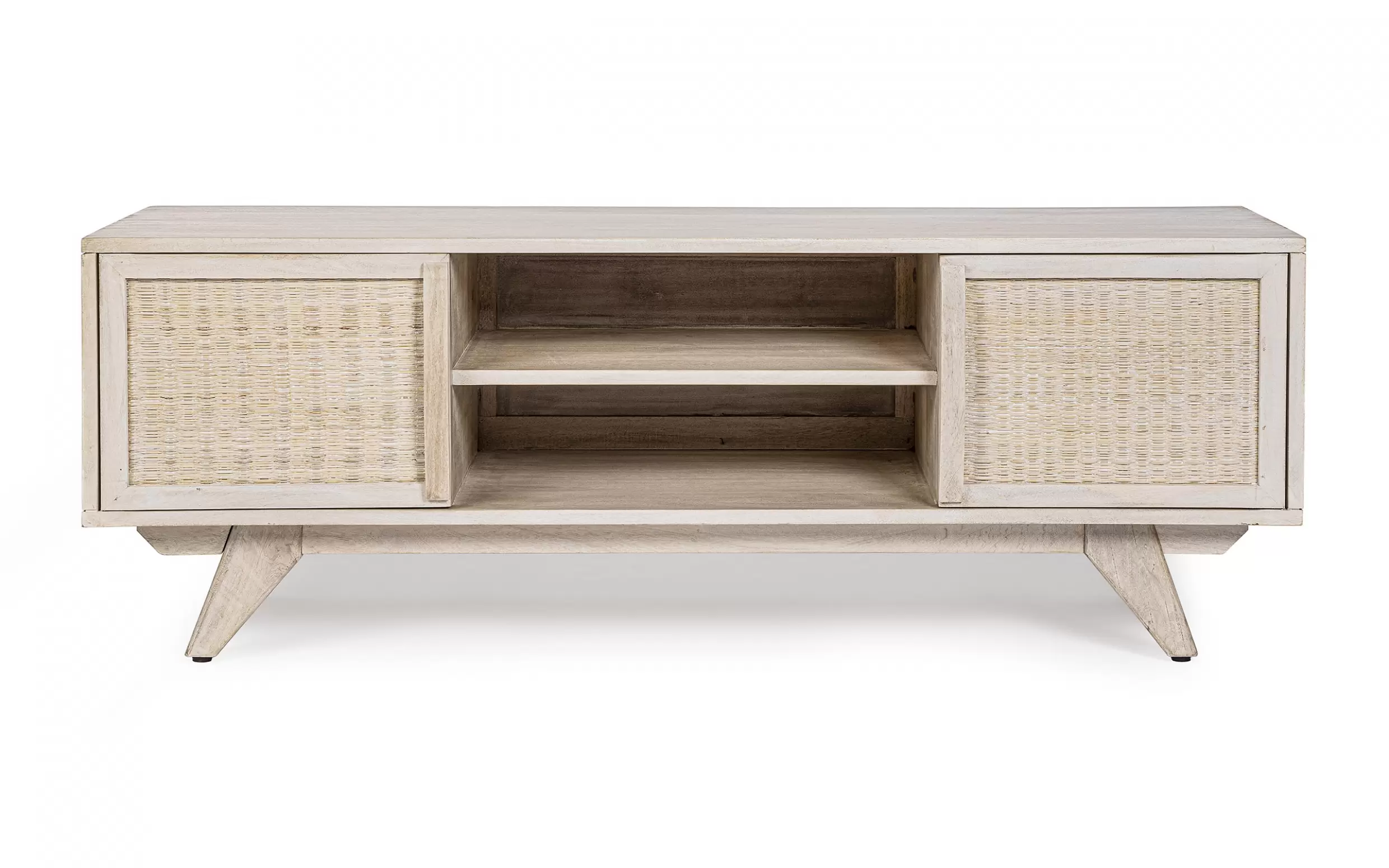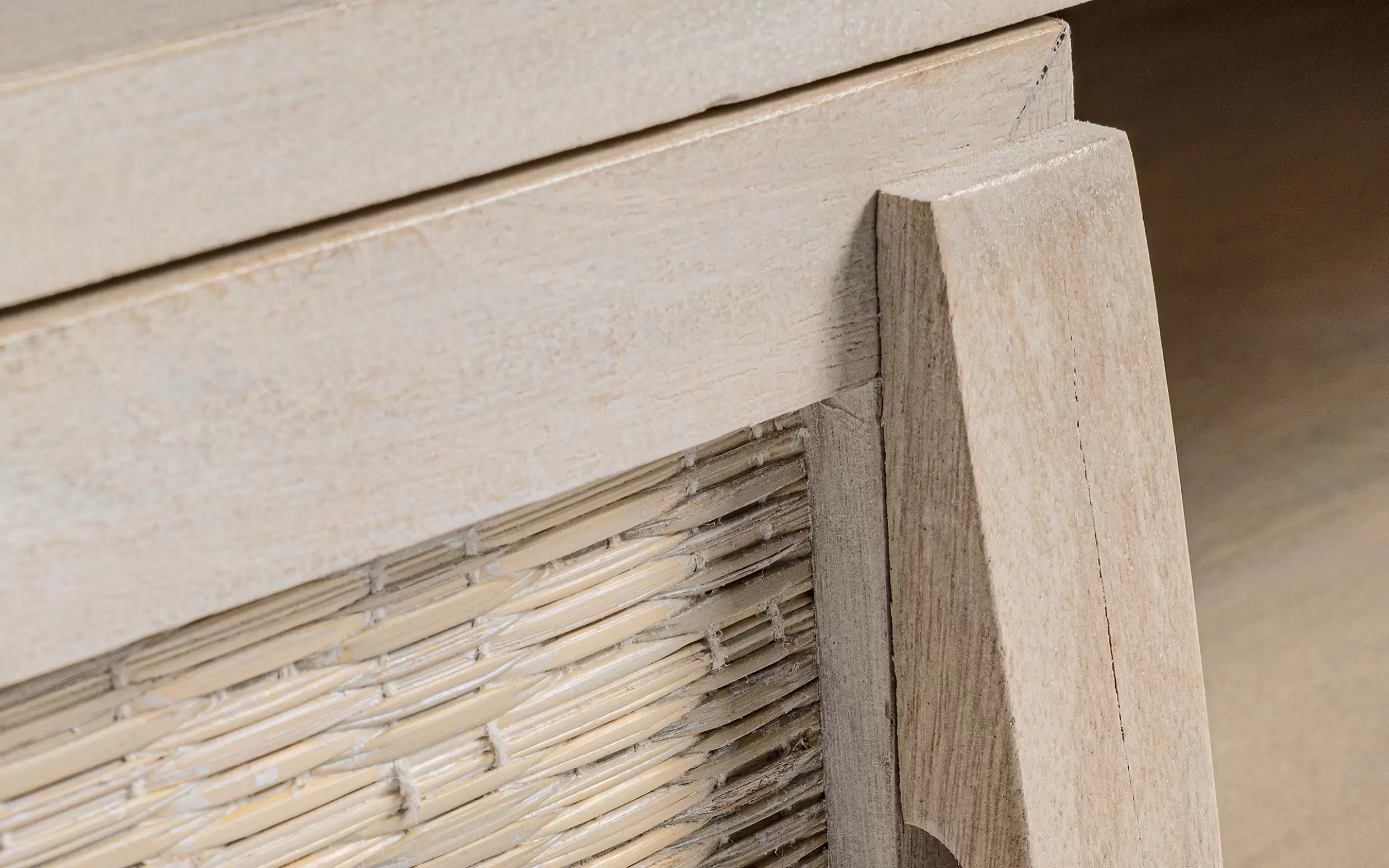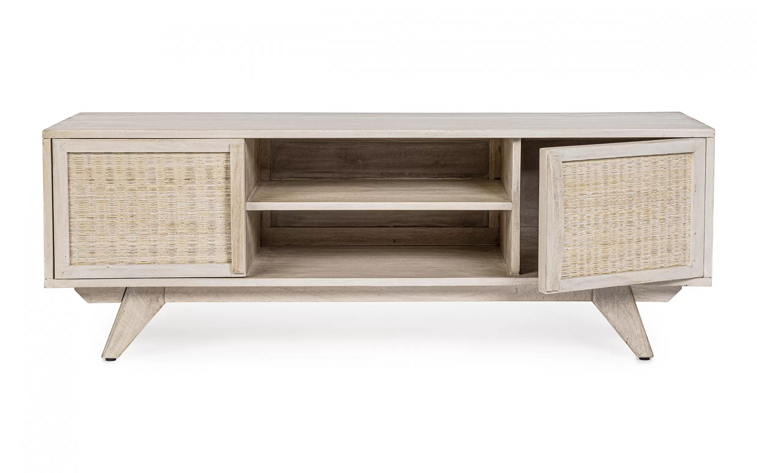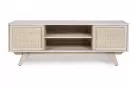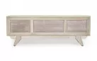 Szafka RTV SAHANA to stylowe połączenie drewna mango i naturalnego rattanu, które nadaje meblowi lekkości i subtelnego charakteru. Wykończenie w kolorze white wash podkreśla fakturę drewna, a rattanowe fronty wprowadzają naturalny klimat do wnętrza. Niska forma szafki sprawia, że świetnie sprawdzi się w roli podstawy pod telewizor i praktycznego schowka.
