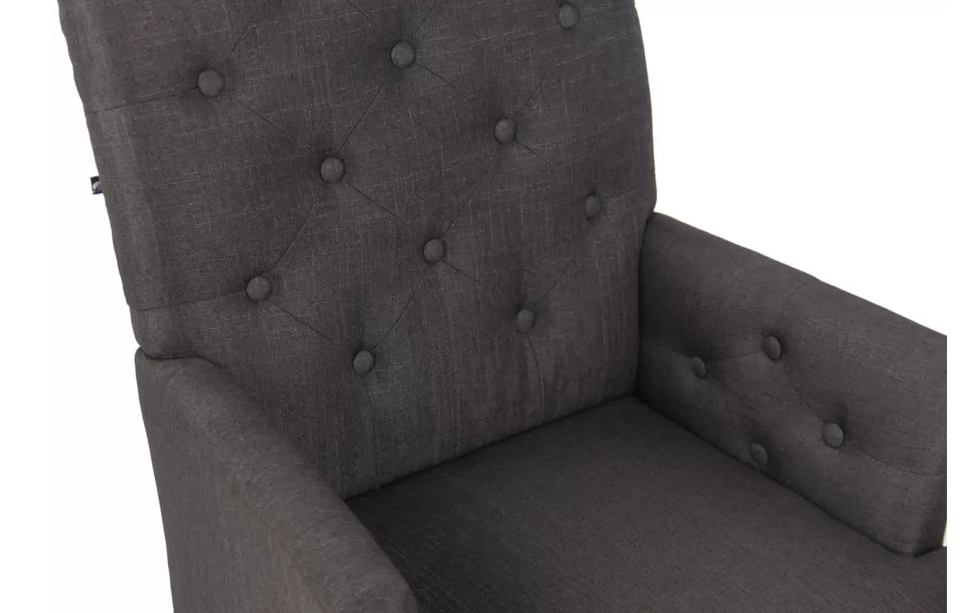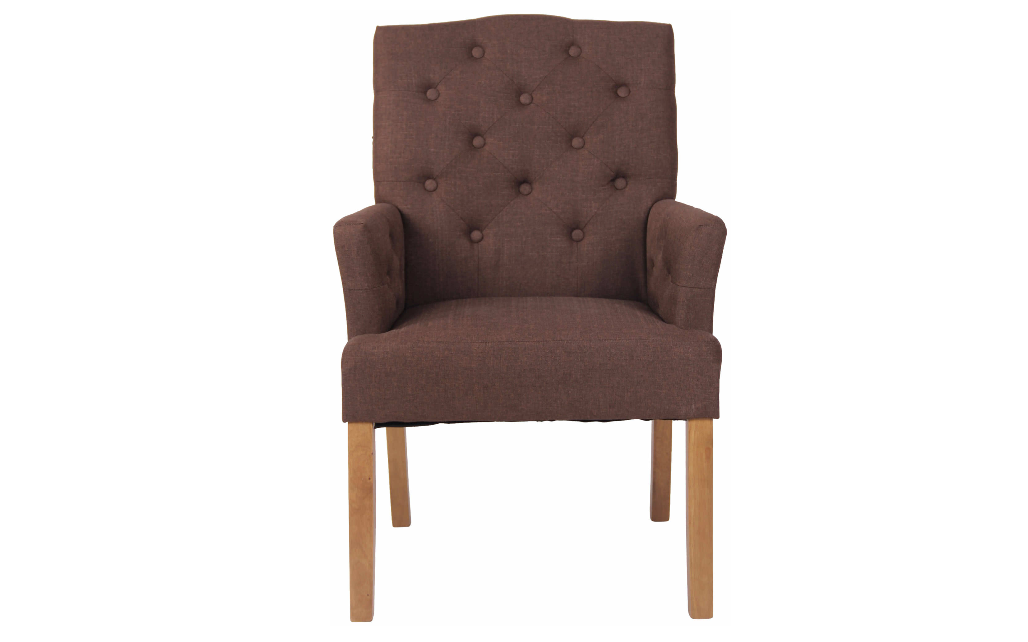 Wygodne krzesło do jadalni. Fotel w angielskim stylu Chesterfield przyciąga wzrok swoim klasycznym wyglądem. Praktyczne podłokietniki, gruba tapicerka i łatwe w pielęgnacji obicie z tkaniny zapewniają doskonały komfort. Fotel stoi stabilnie i stabilnie na czworonożnej ramie wykonanej z drewna kauczukowego. To wygodne, solidne, a jednocześnie stylowe siedzisko do codziennego użytku i doskonały dodatek do klasycznie urządzonych pomieszczeń.