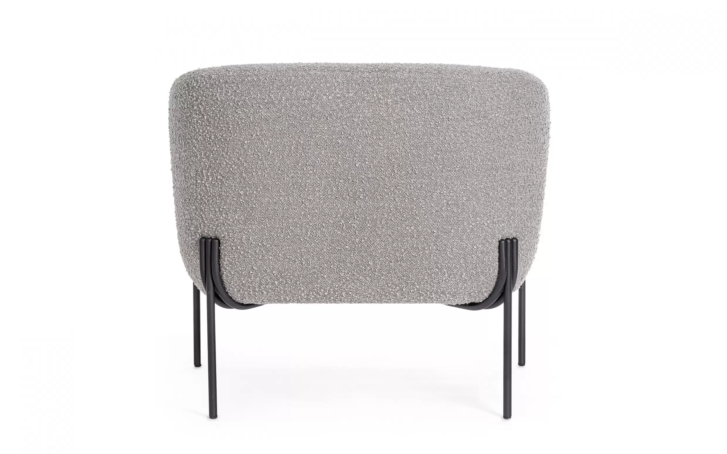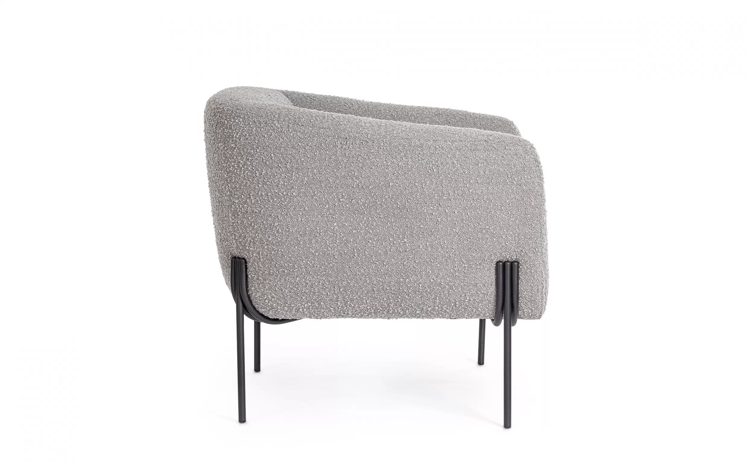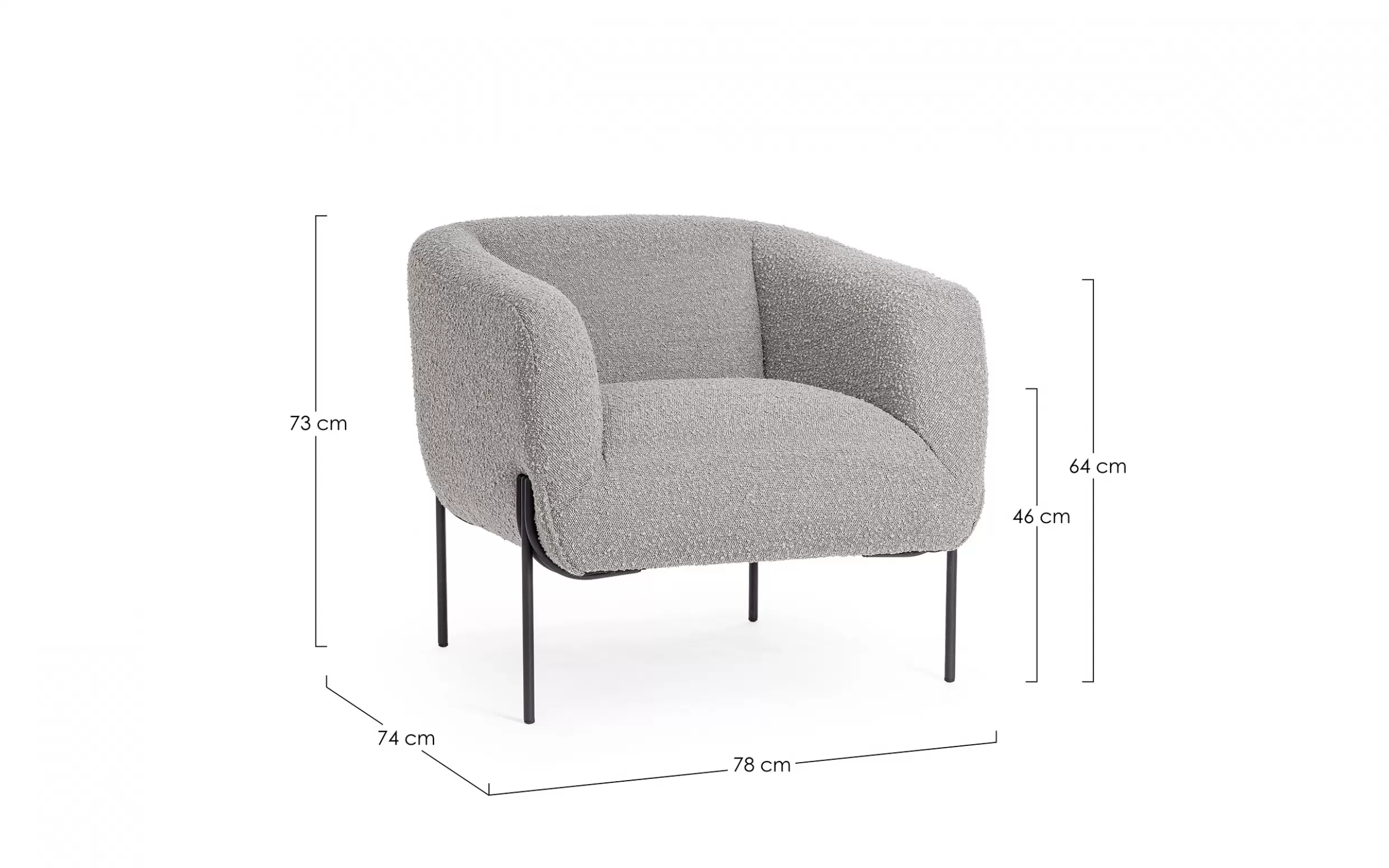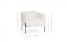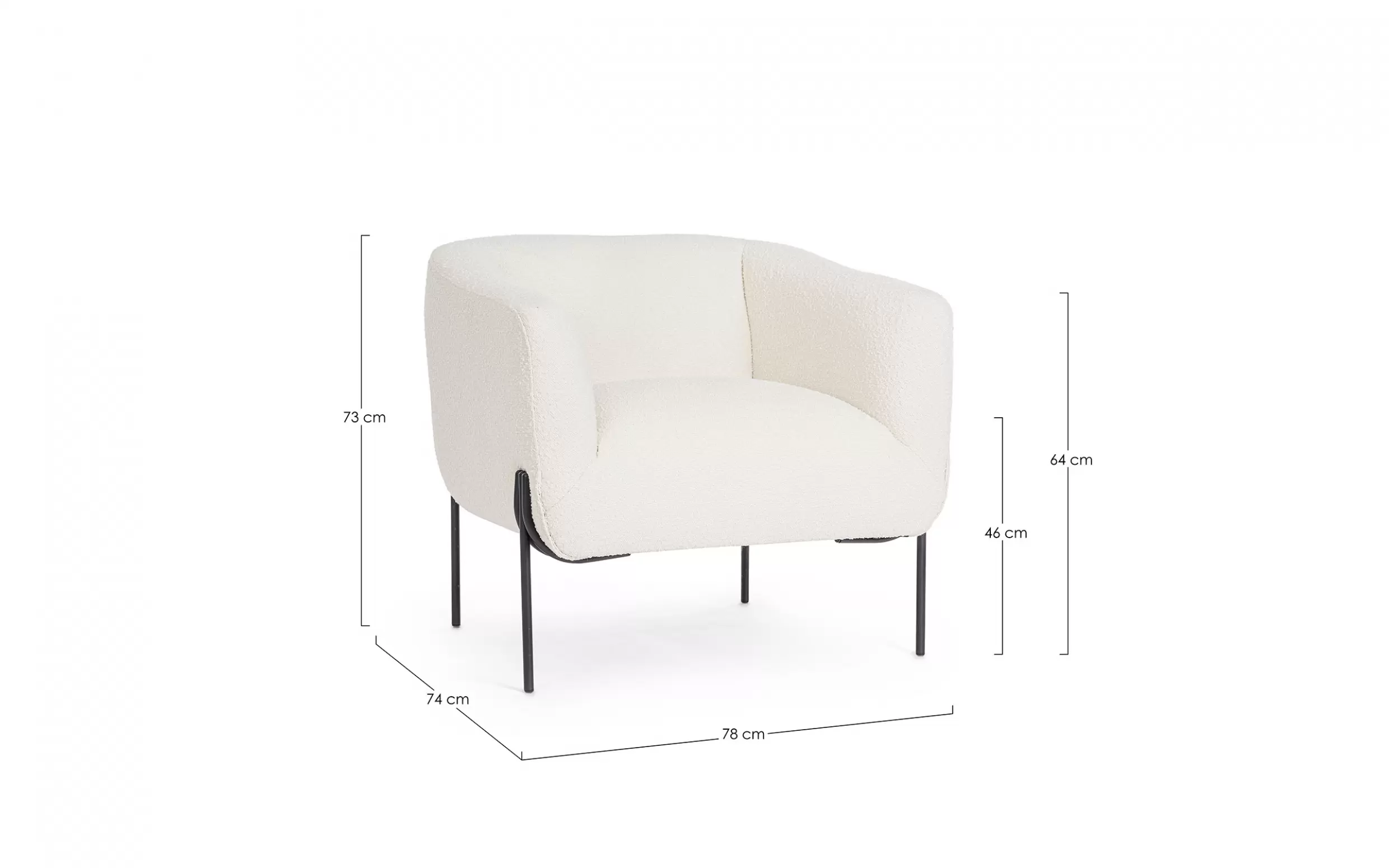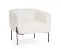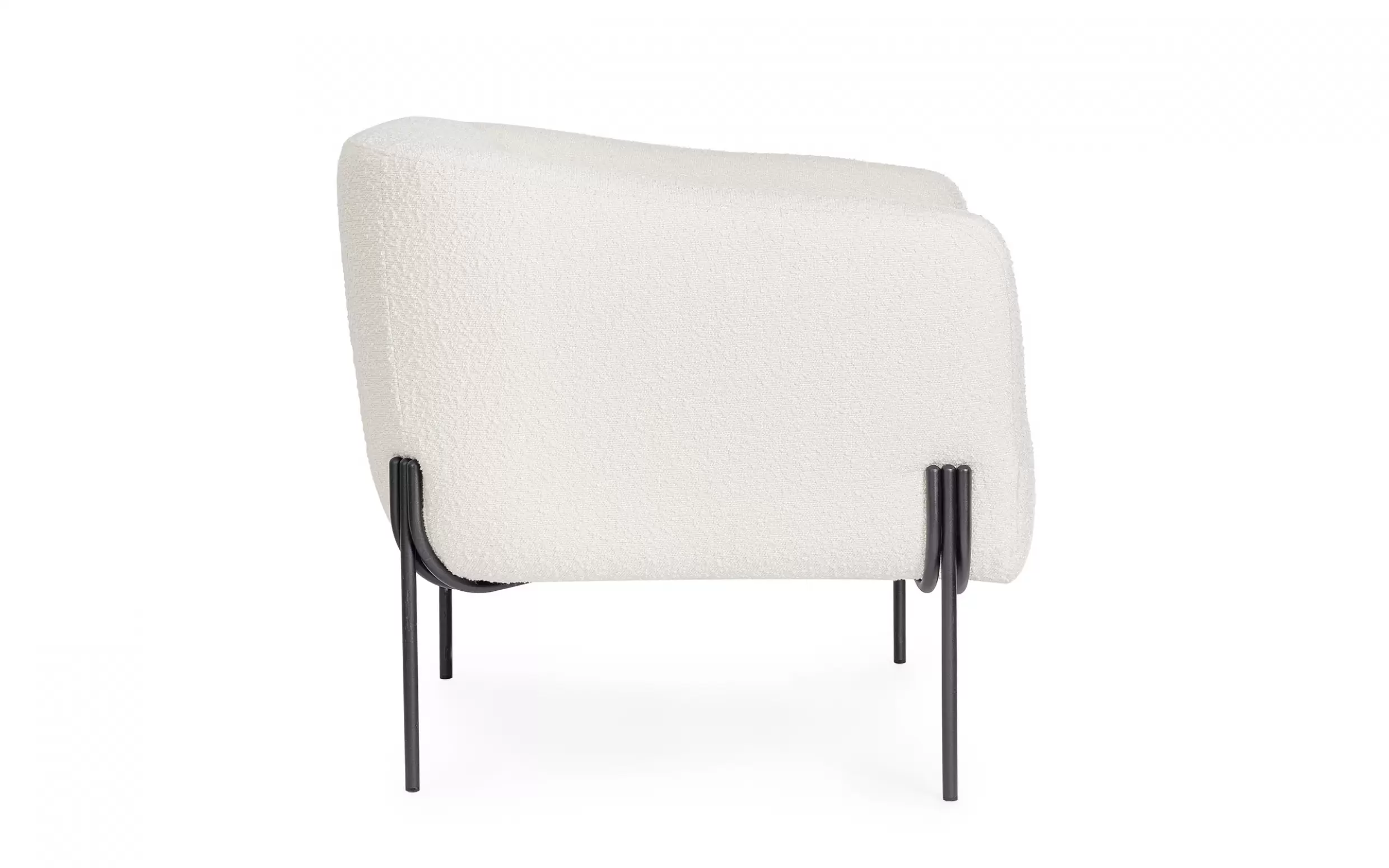 Fotel Claudine Bouclé marki Bizzotto to połączenie elegancji i wygody. Konstrukcja ze sklejki, stalowe nogi malowane proszkowo i tapicerka z poliestru o efekcie bouclé tworzą nowoczesny i przytulny design. Wypełnienie pianką poliuretanową (siedzisko 28 kg/m³, oparcie 20 kg/m³) gwarantuje komfort użytkowania.