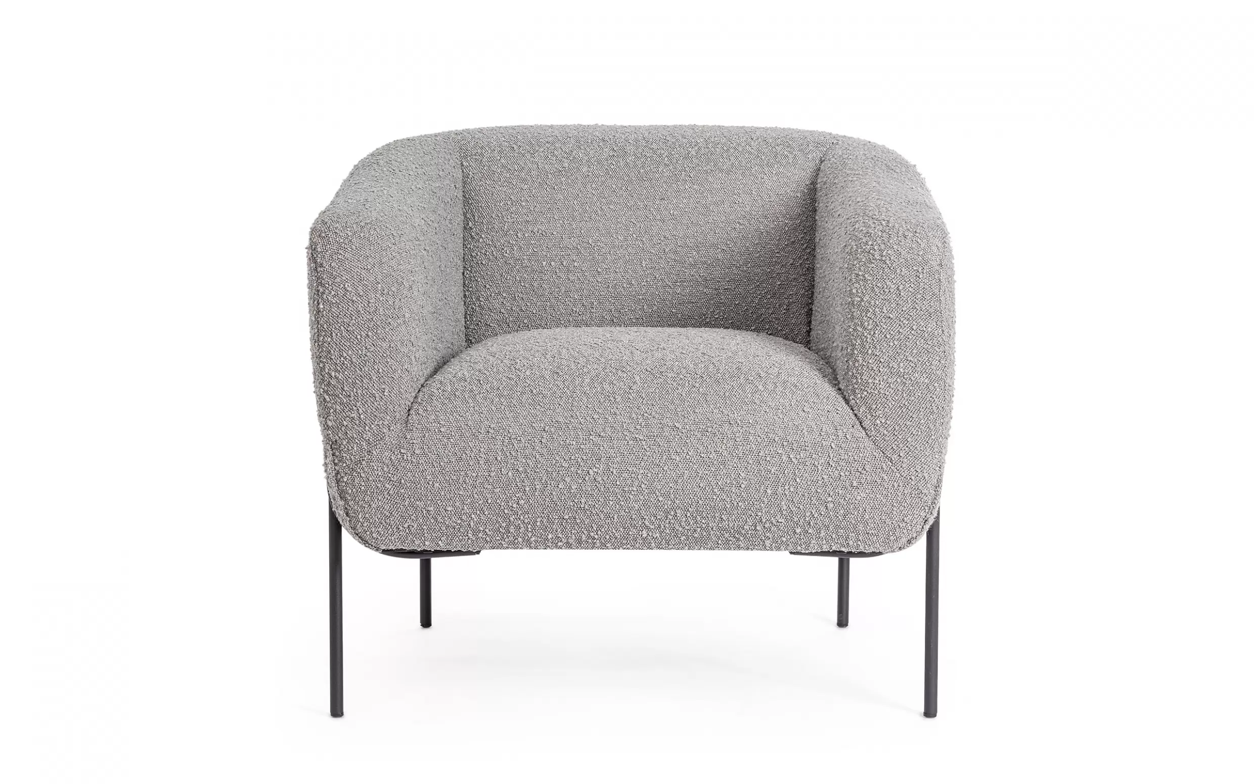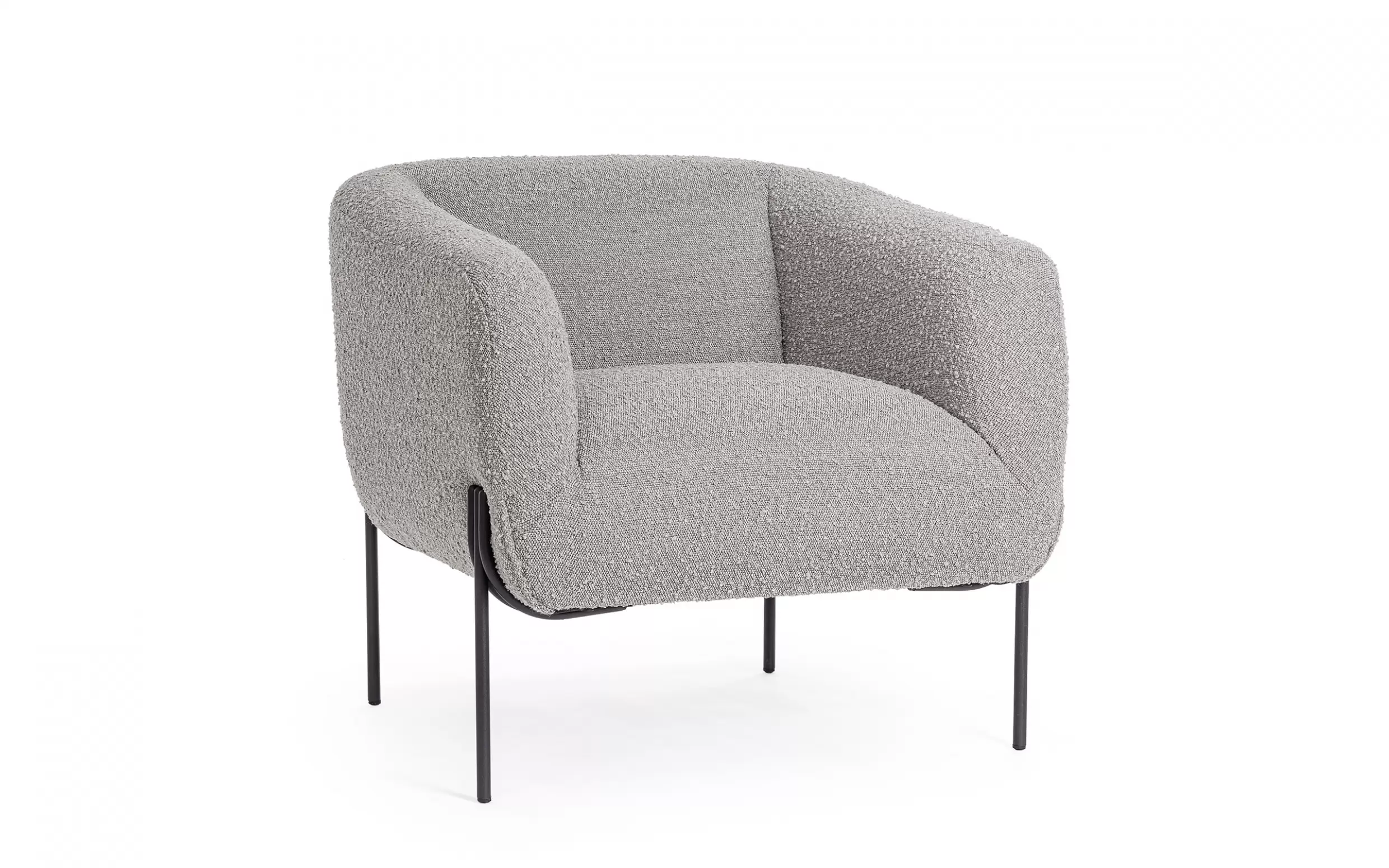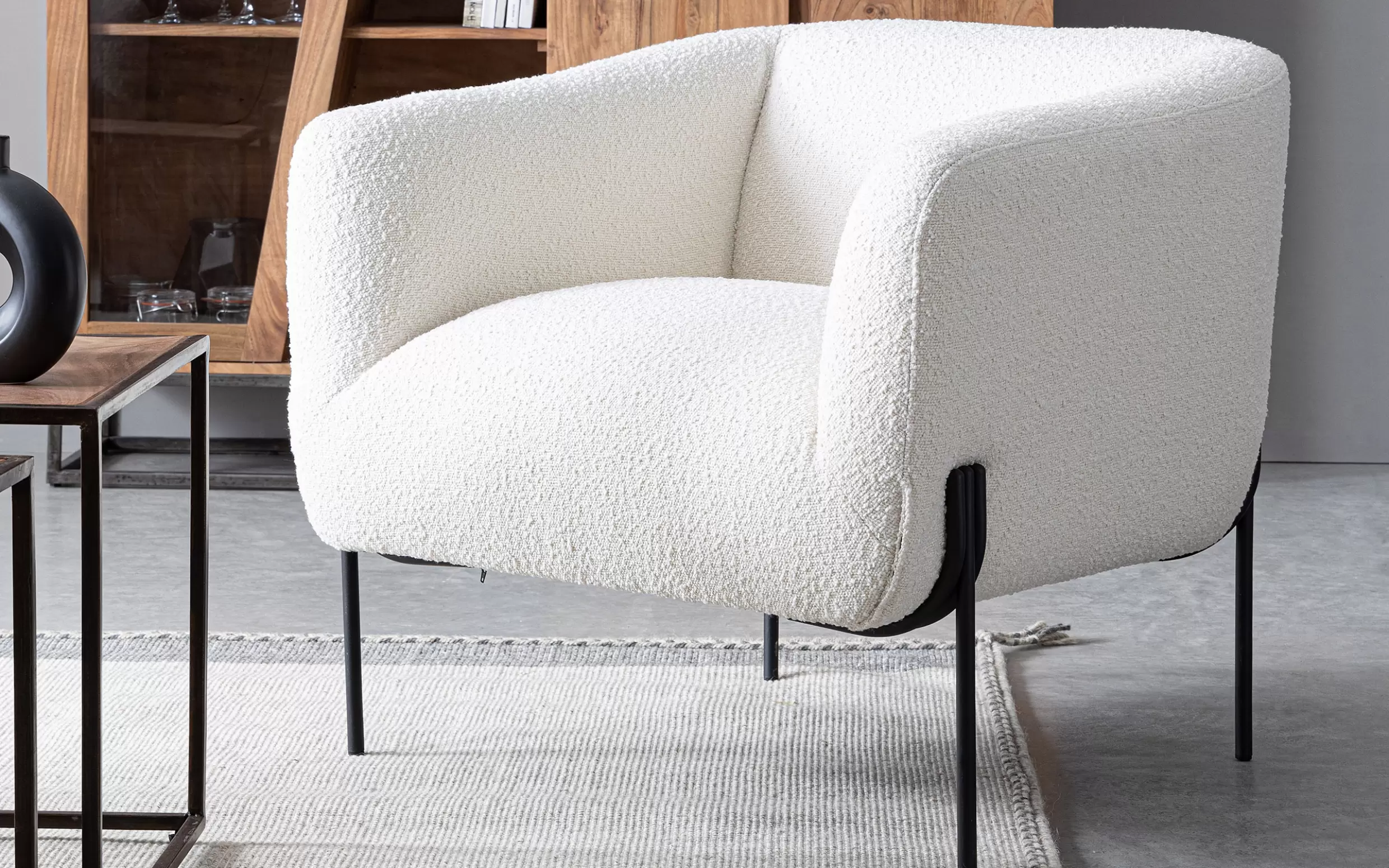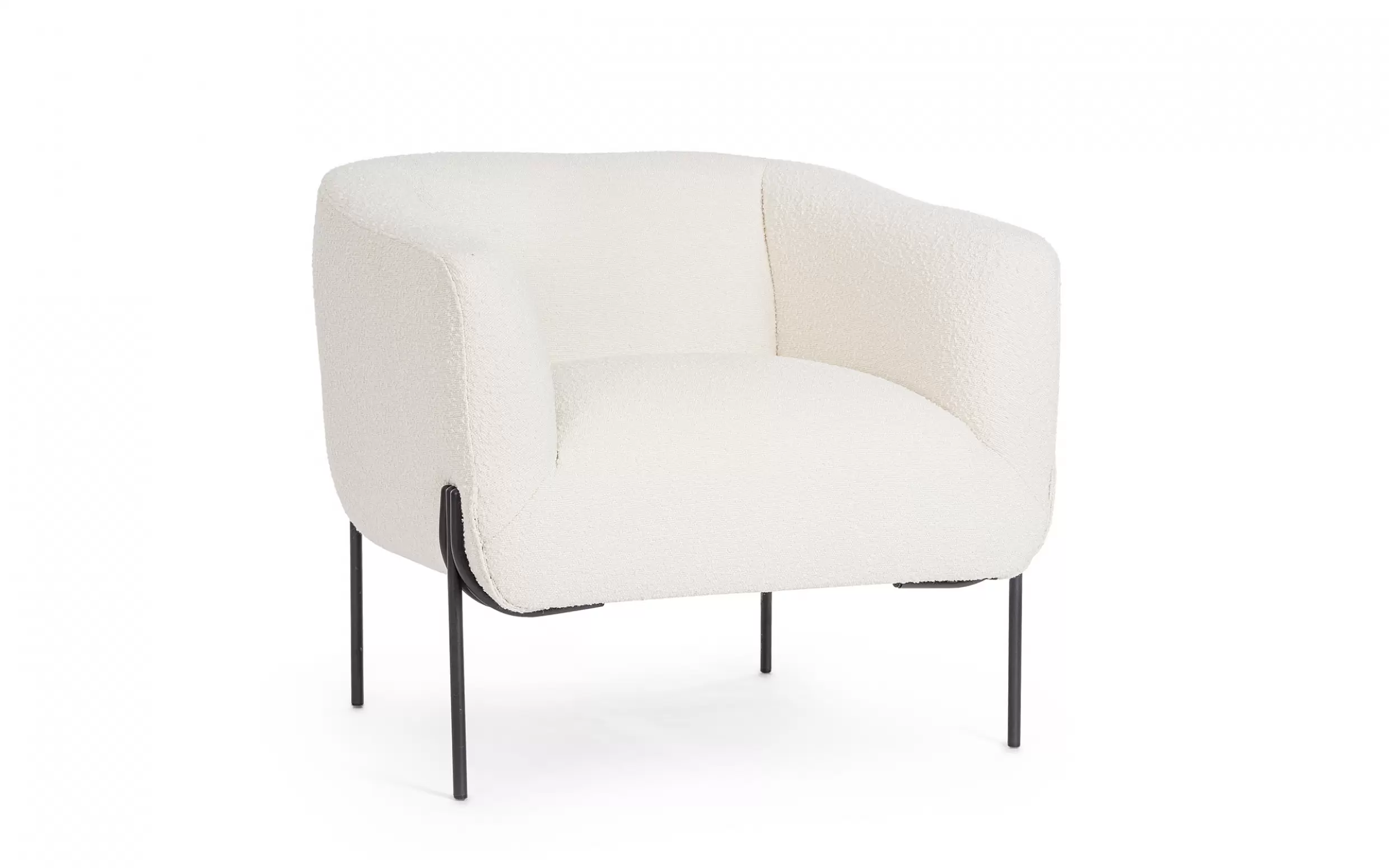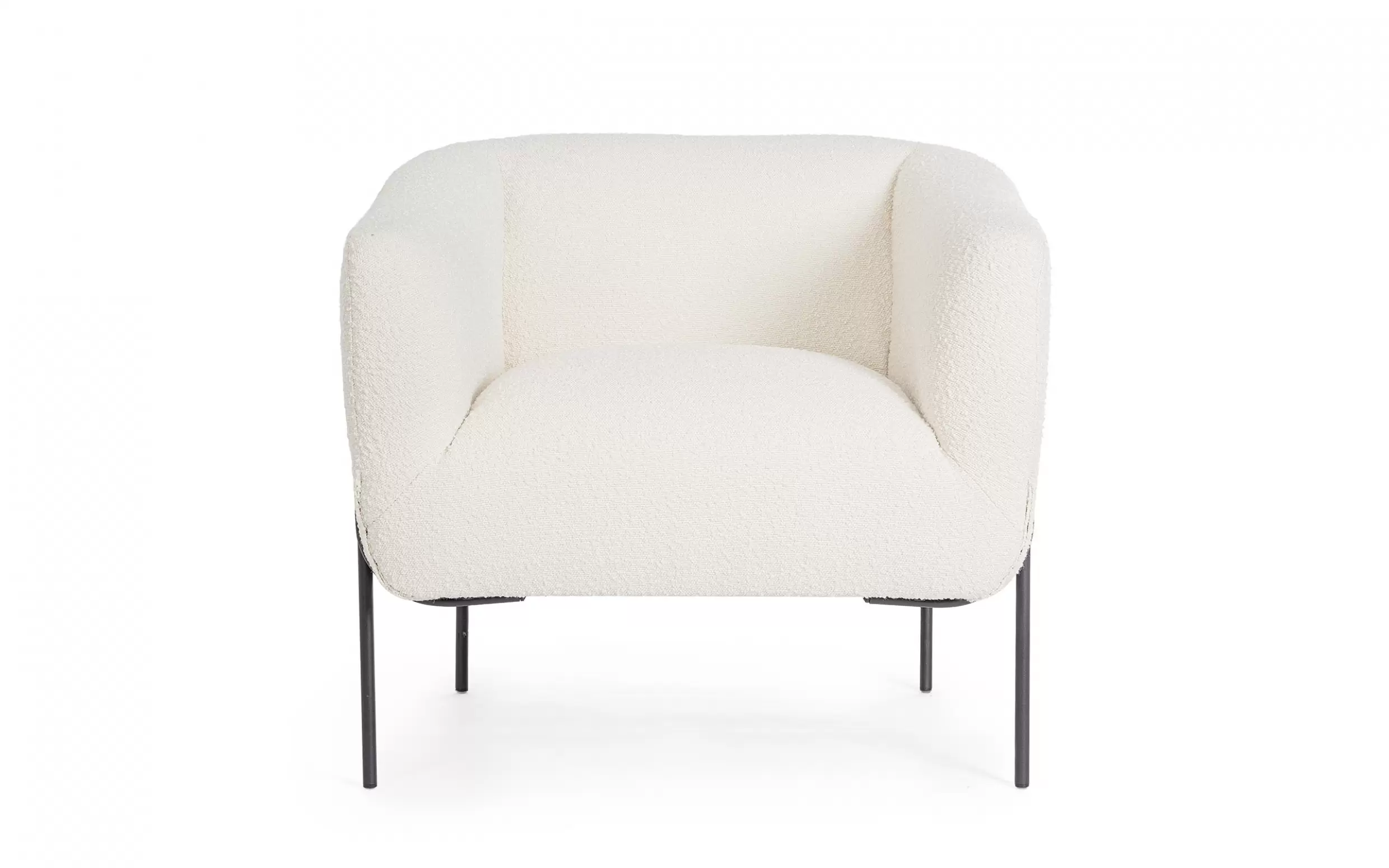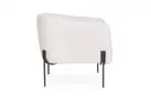 Fotel Claudine Bouclé marki Bizzotto to połączenie elegancji i wygody. Konstrukcja ze sklejki, stalowe nogi malowane proszkowo i tapicerka z poliestru o efekcie bouclé tworzą nowoczesny i przytulny design. Wypełnienie pianką poliuretanową (siedzisko 28 kg/m³, oparcie 20 kg/m³) gwarantuje komfort użytkowania.