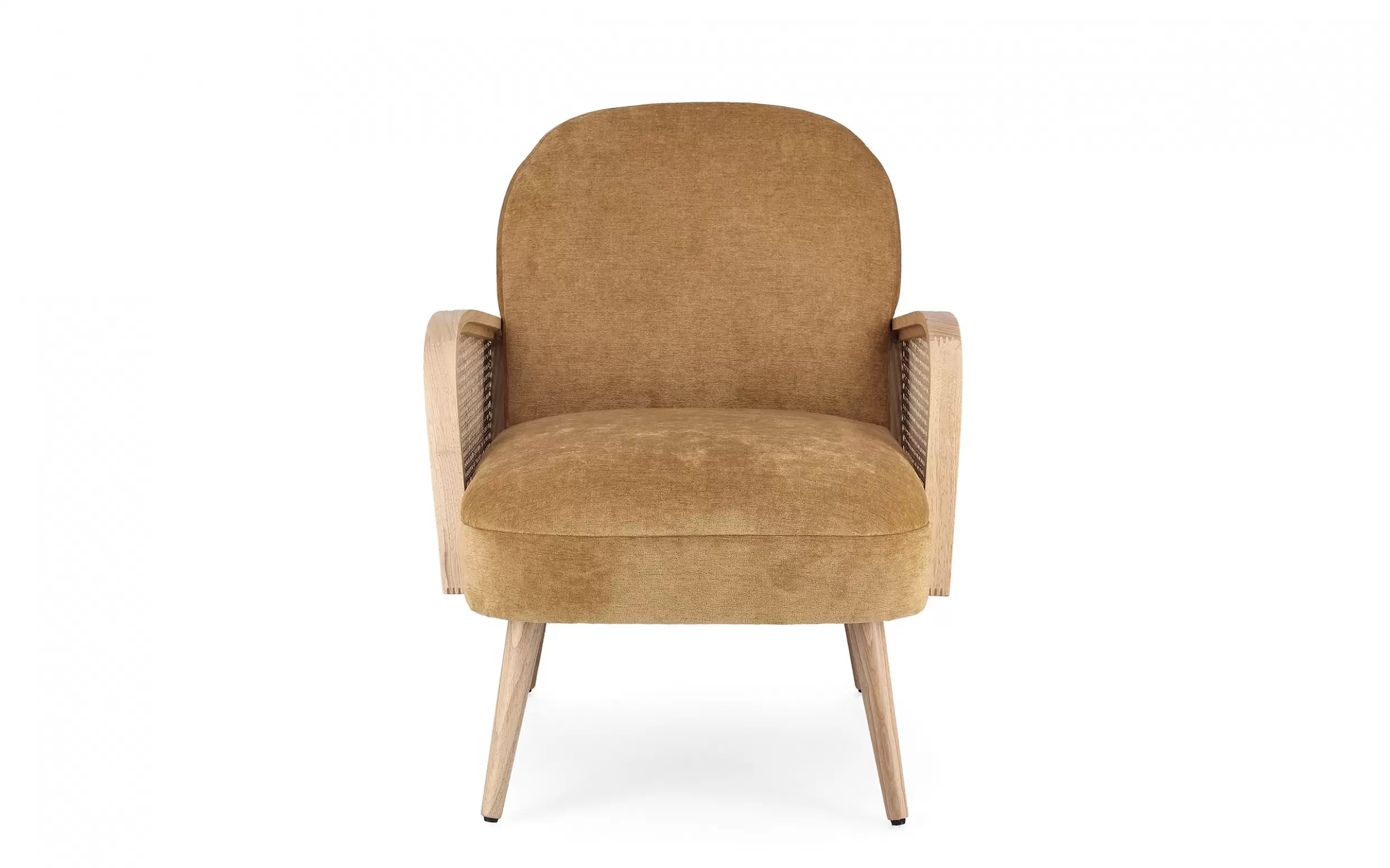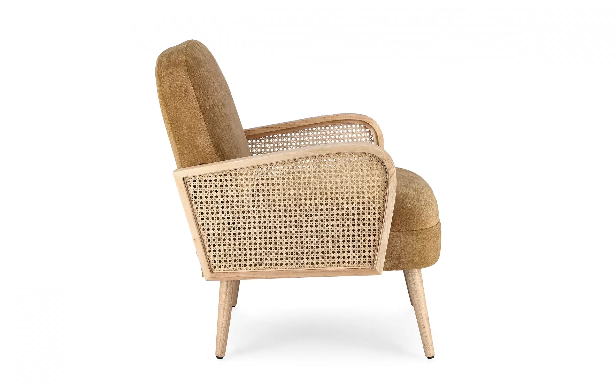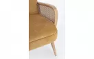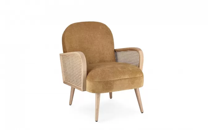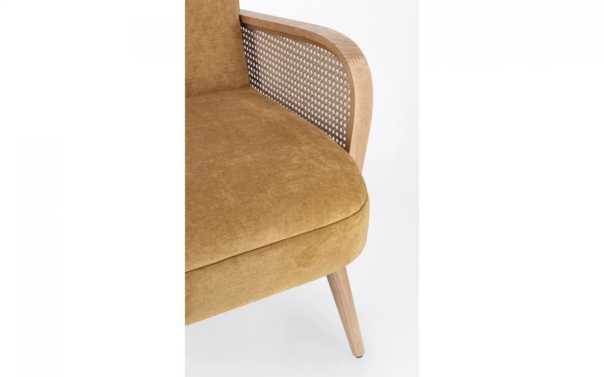 Fotel Dalida marki Bizzotto to eleganckie połączenie drewna, rattanu i aksamitnej tkaniny. Rama wykonana z sosny i sklejki, uzupełniona nogami z drewna kauczukowego, gwarantuje solidność i stabilność. Podłokietniki zdobione rattanowymi wstawkami nadają całości lekkości i naturalnego uroku. Aksamitna tapicerka z poliestru w połączeniu z piankowym wypełnieniem o gęstości 24 kg/m³ zapewnia wysoki komfort użytkowania. Idealny wybór do salonu, pokoju dziennego lub eleganckiej sypialni.