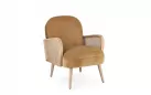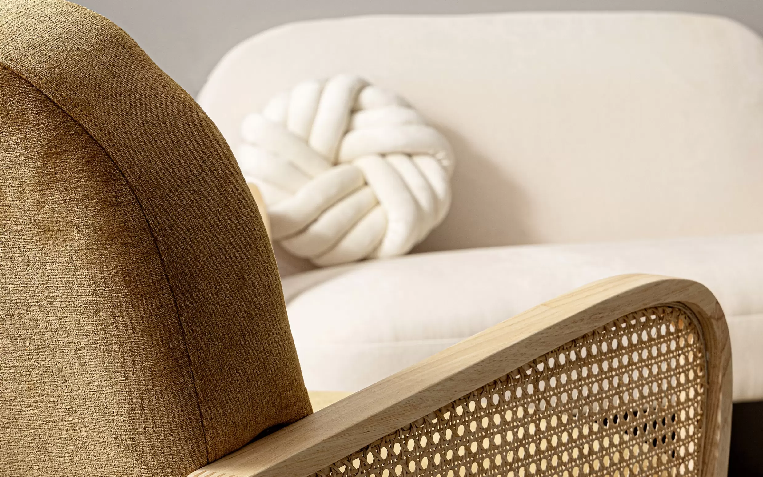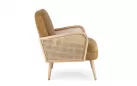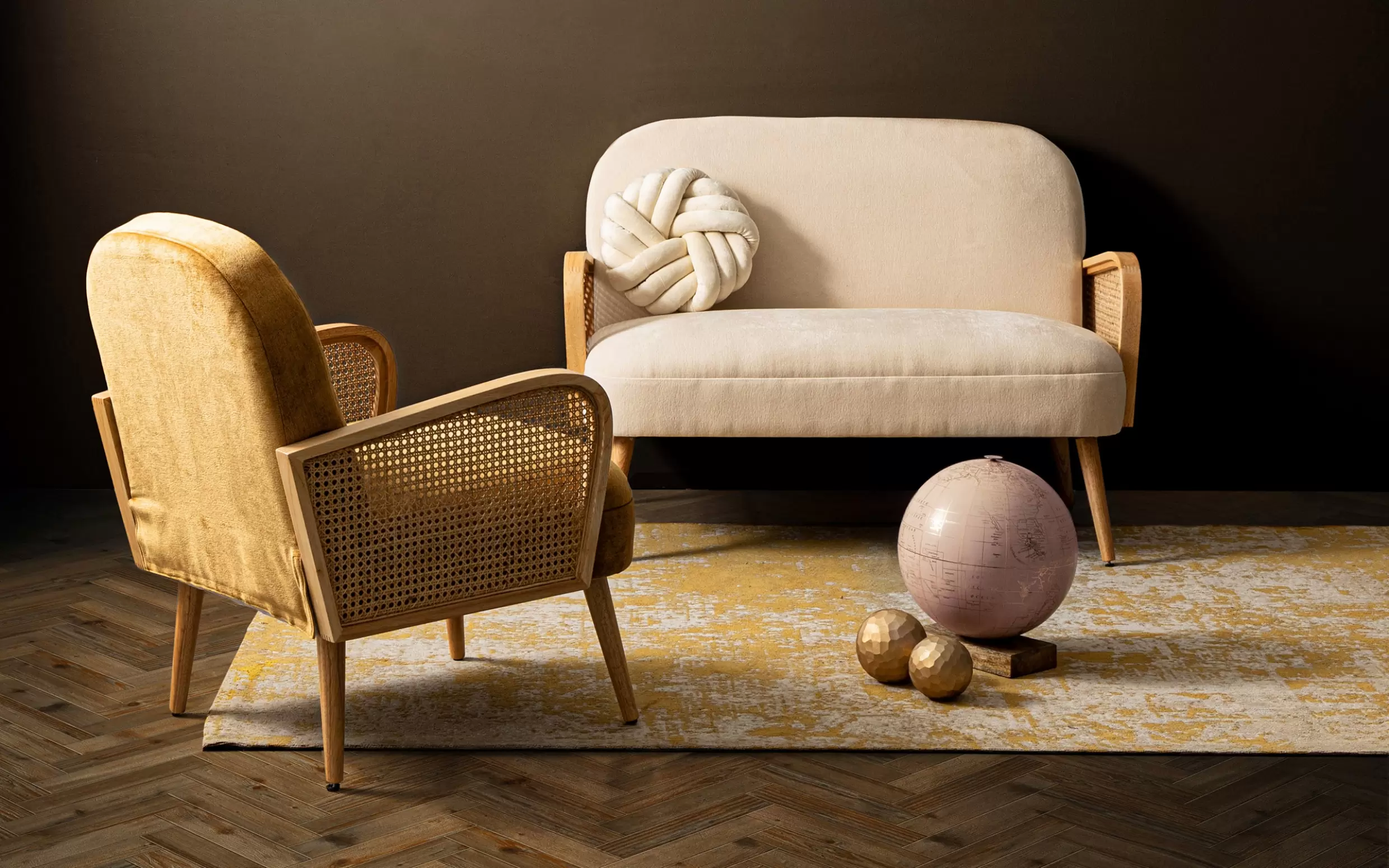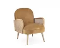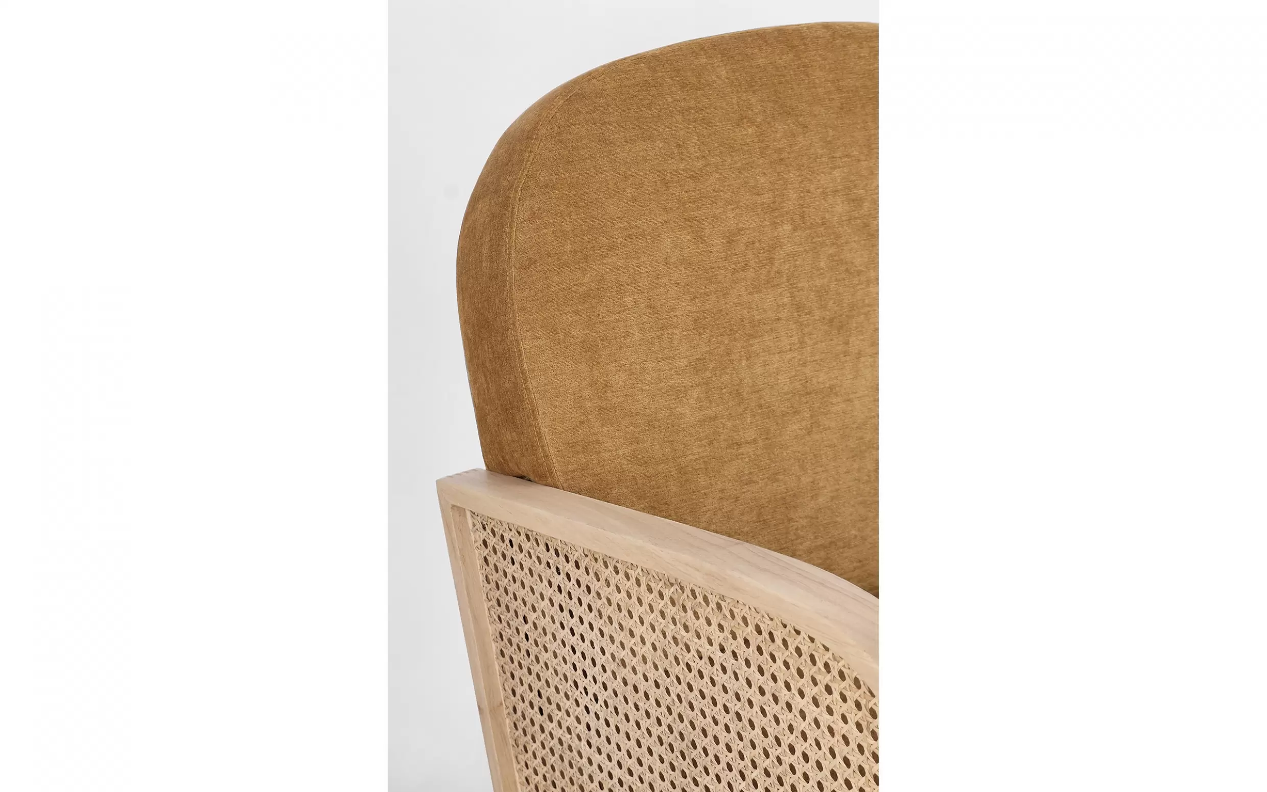Fotel Dalida marki Bizzotto to eleganckie połączenie drewna, rattanu i aksamitnej tkaniny. Rama wykonana z sosny i sklejki, uzupełniona nogami z drewna kauczukowego, gwarantuje solidność i stabilność. Podłokietniki zdobione rattanowymi wstawkami nadają całości lekkości i naturalnego uroku. Aksamitna tapicerka z poliestru w połączeniu z piankowym wypełnieniem o gęstości 24 kg/m³ zapewnia wysoki komfort użytkowania. Idealny wybór do salonu, pokoju dziennego lub eleganckiej sypialni.
