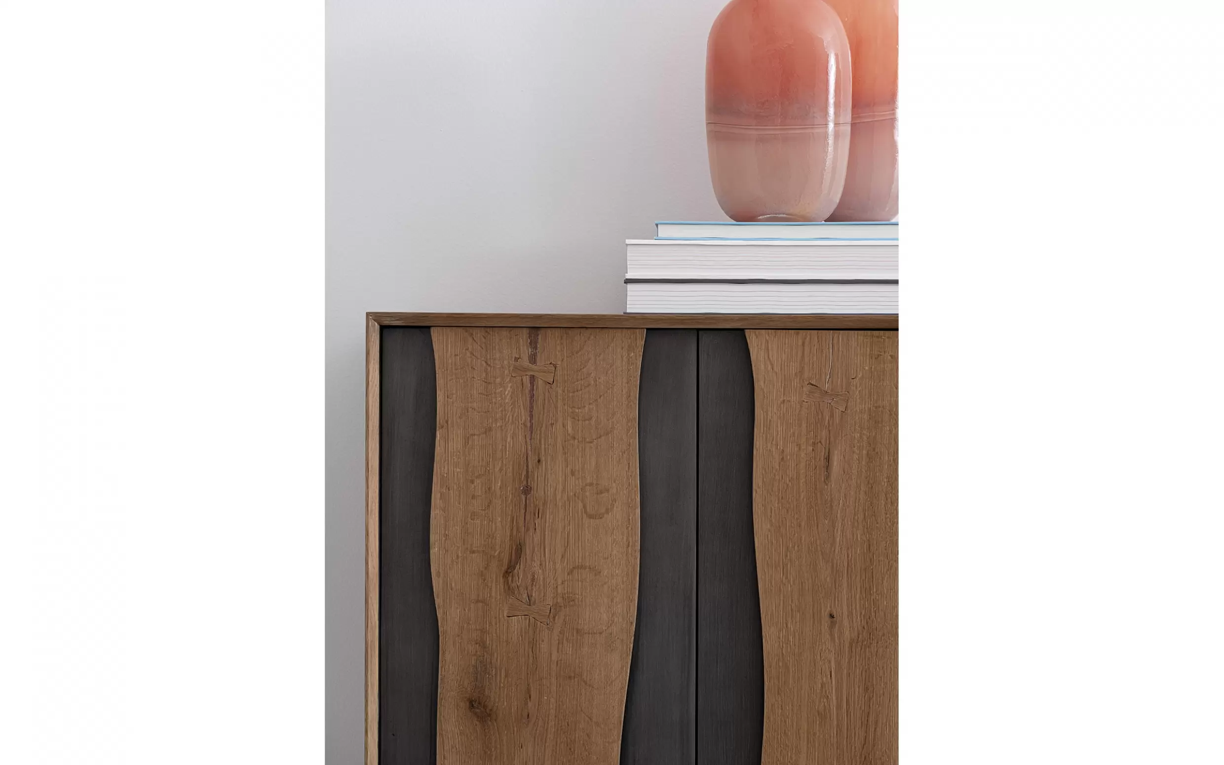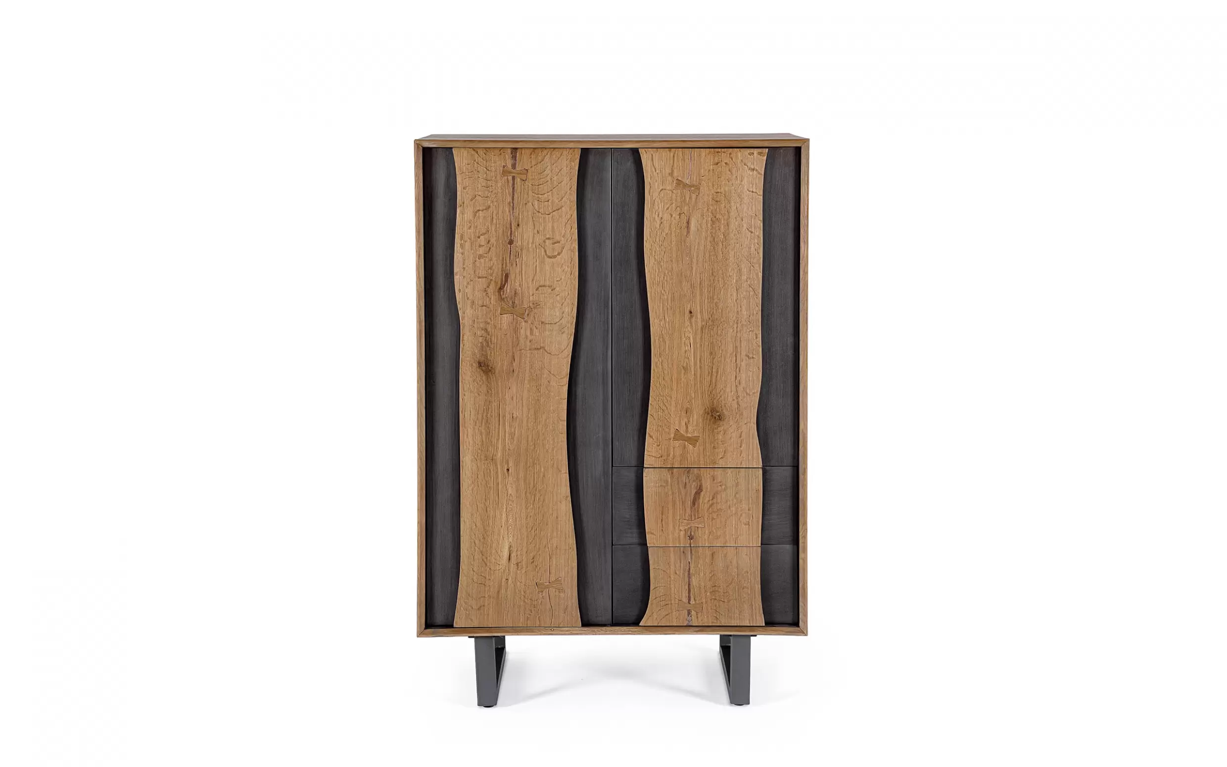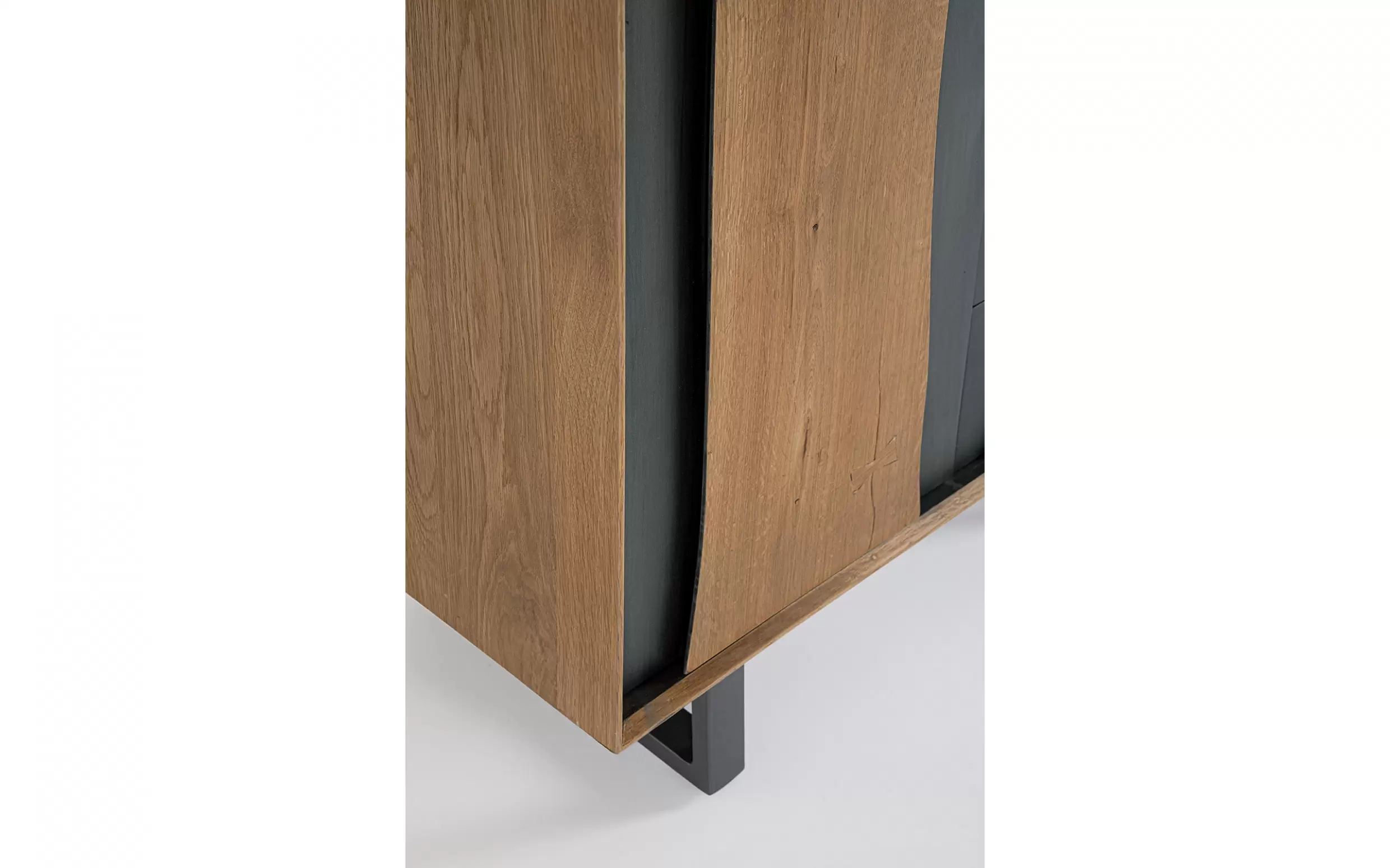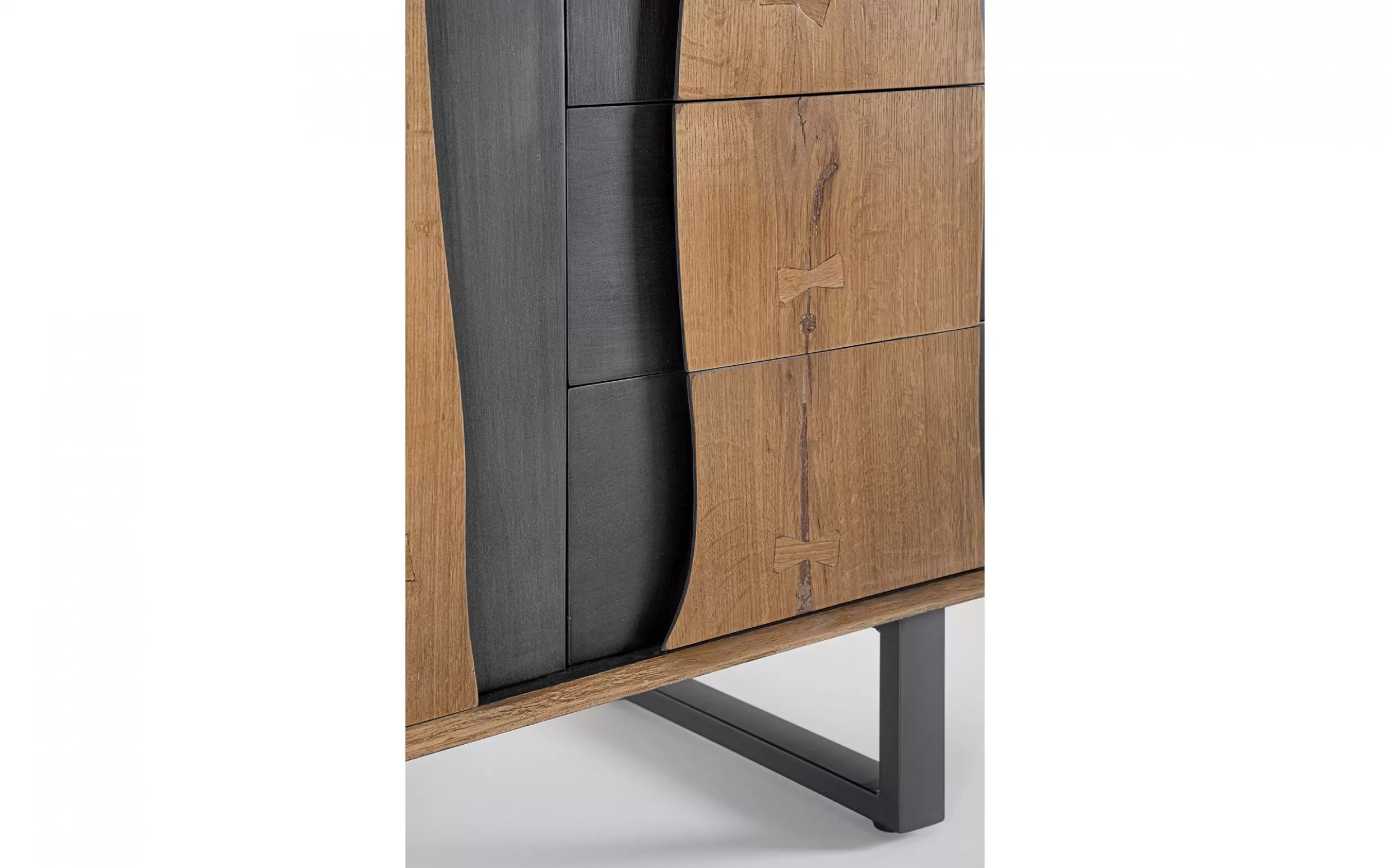 Komoda GARWOOD to nowoczesny mebel, który łączy elegancję naturalnego drewna z funkcjonalnością. Wykonana została z MDF fornirowanego dębem i pokryta wykończeniem na bazie wody, co podkreśla piękno drewna i zapewnia trwałość. Wnętrze w kolorze antracytowym wyposażono w system cichego domyku, który zwiększa komfort użytkowania. Stabilność gwarantują stalowe nogi malowane proszkowo. Komoda sprawdzi się zarówno w salonie, jak i w gabinecie czy jadalni.