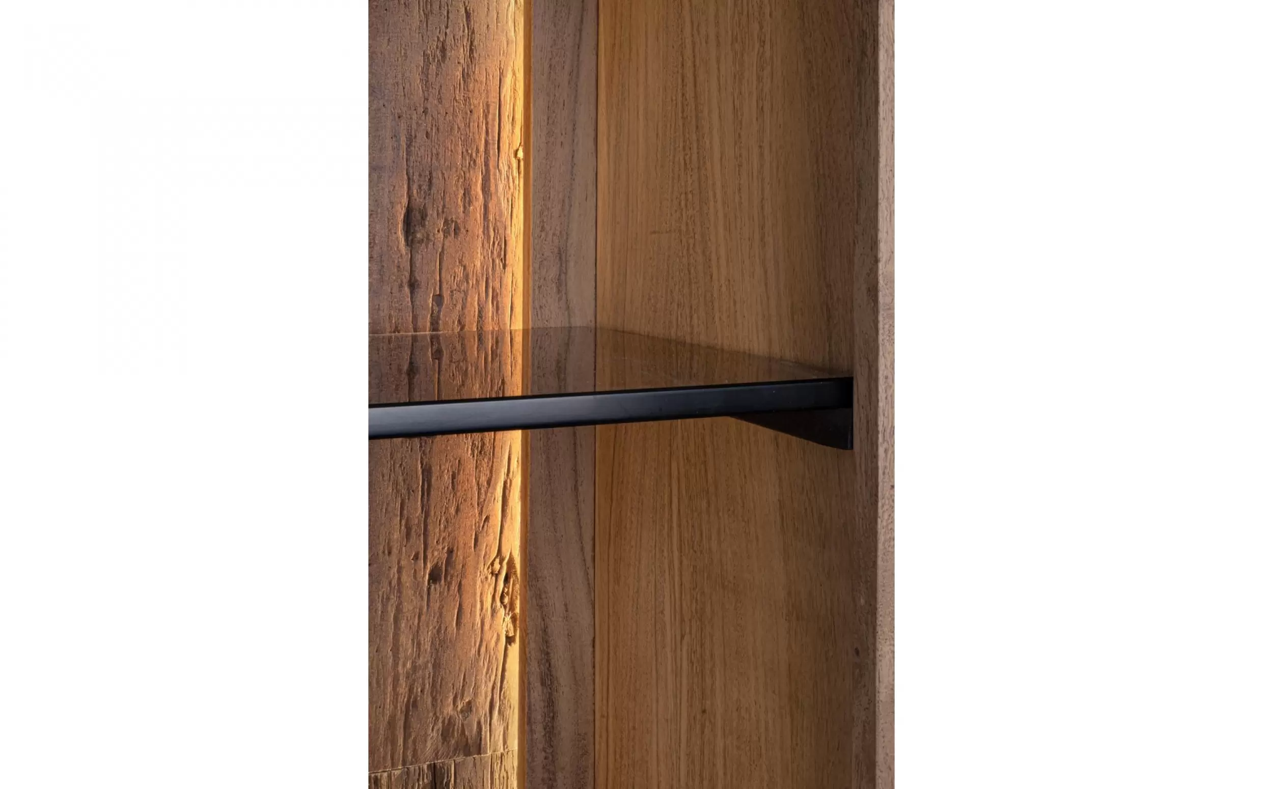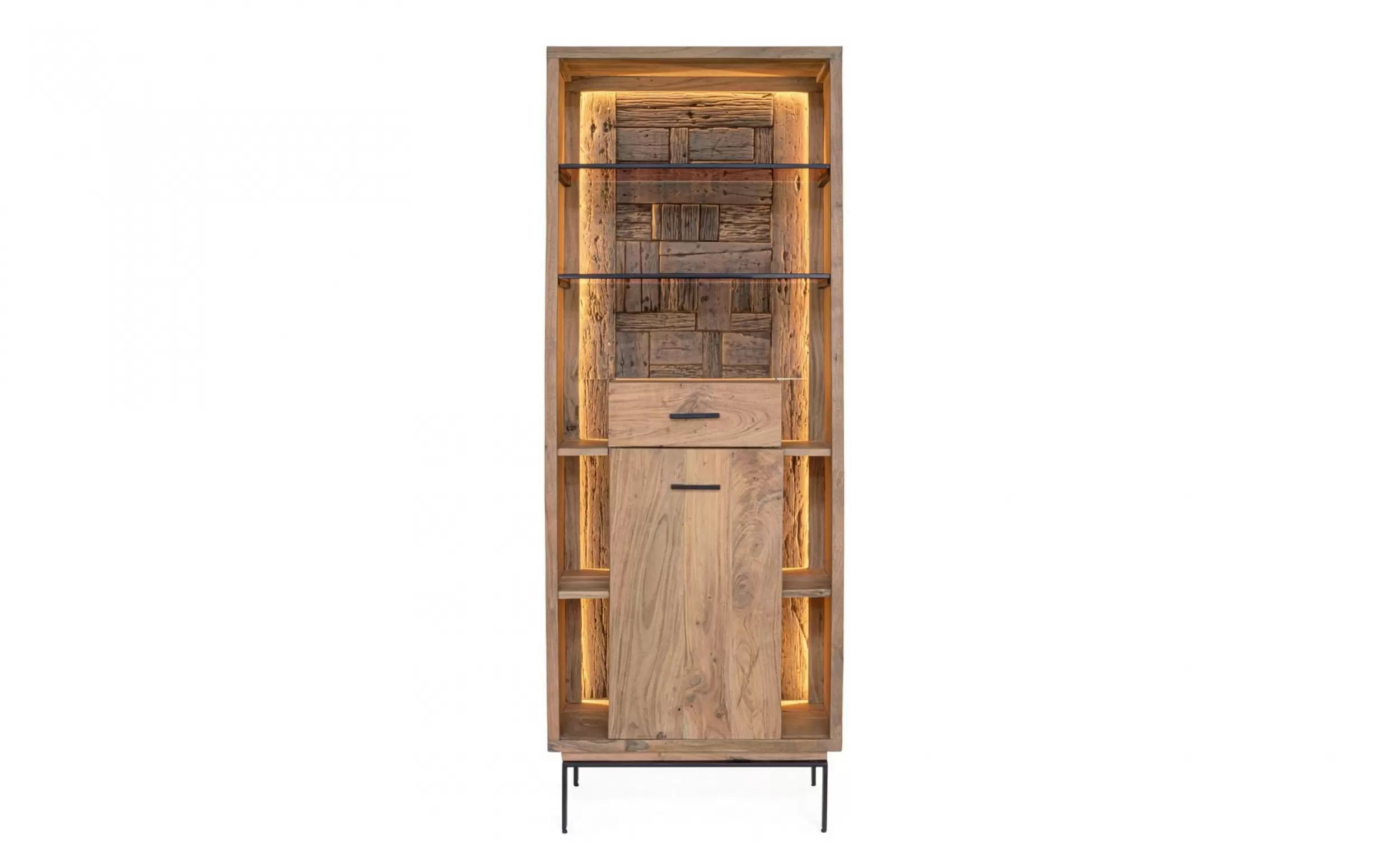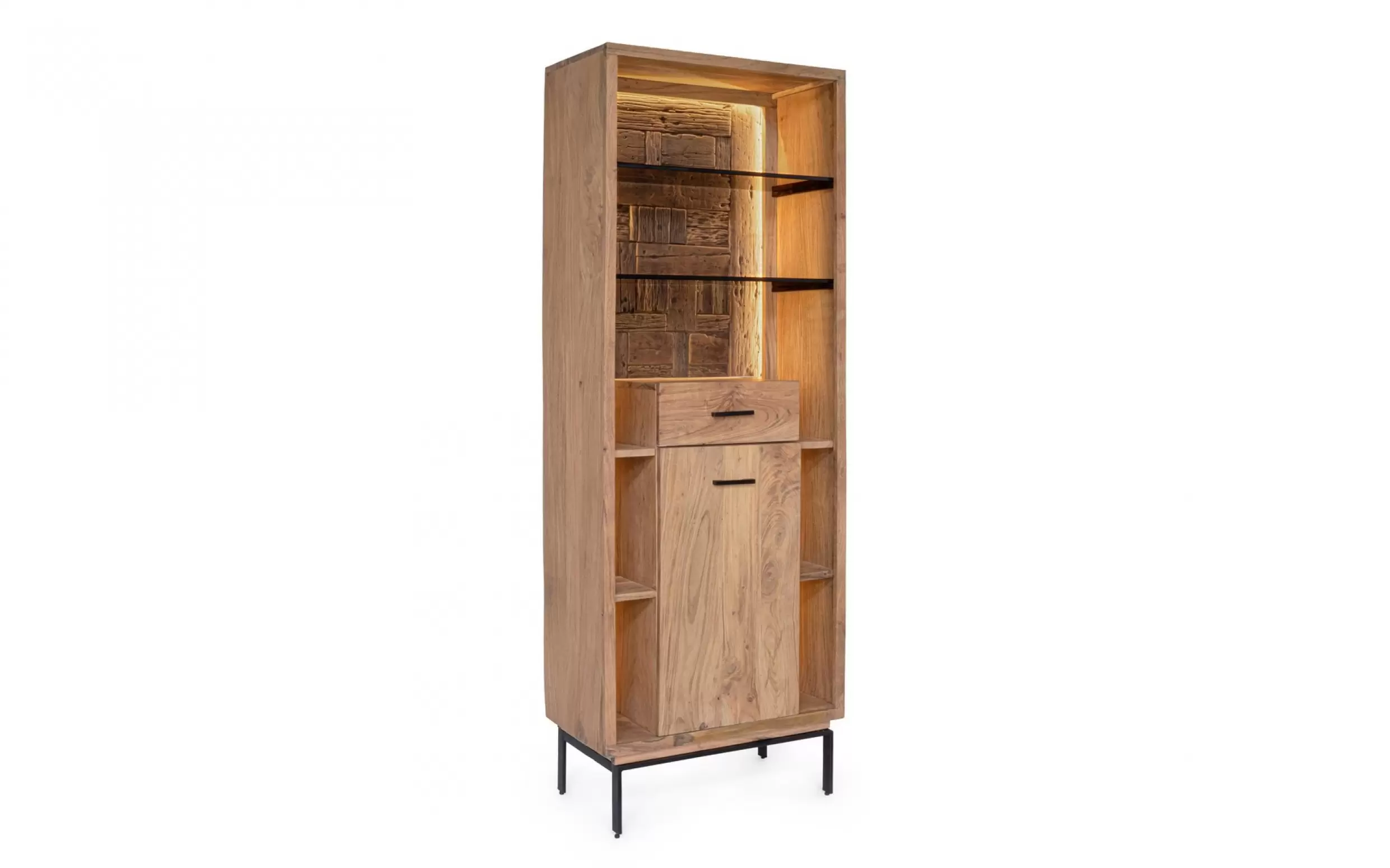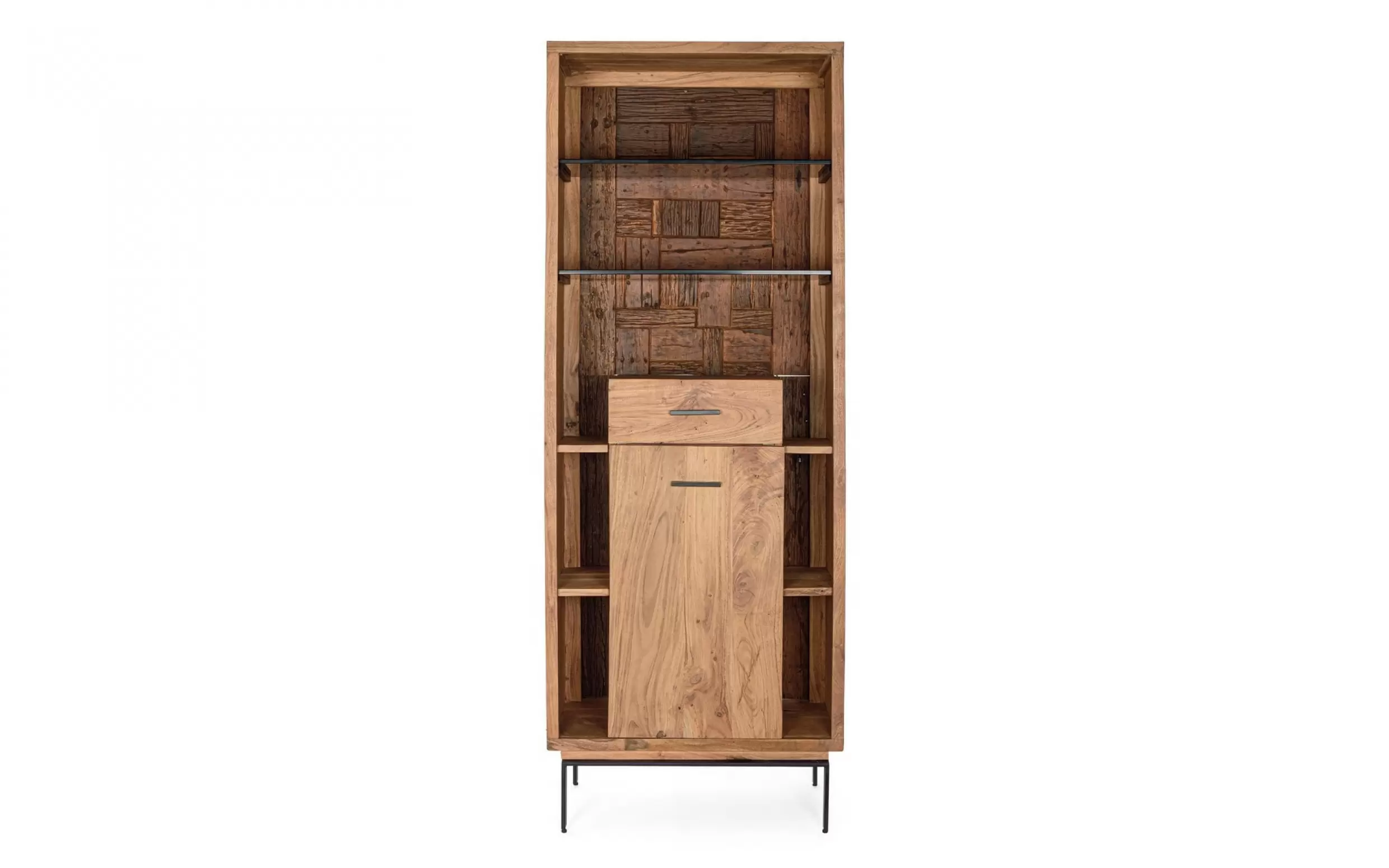 MANGAL High Cabinet 72×40×195 to nowoczesna i praktyczna szafka, która zachwyca połączeniem naturalnego drewna akacjowego ze stalowymi nogami. Wnętrze zostało wykończone drewnem recyklingowanym, nadając meblowi unikalny charakter. Wyposażona w drzwi z systemem cichego domyku oraz wygodne stalowe uchwyty, szafka łączy funkcjonalność z niepowtarzalnym stylem loftowym.
