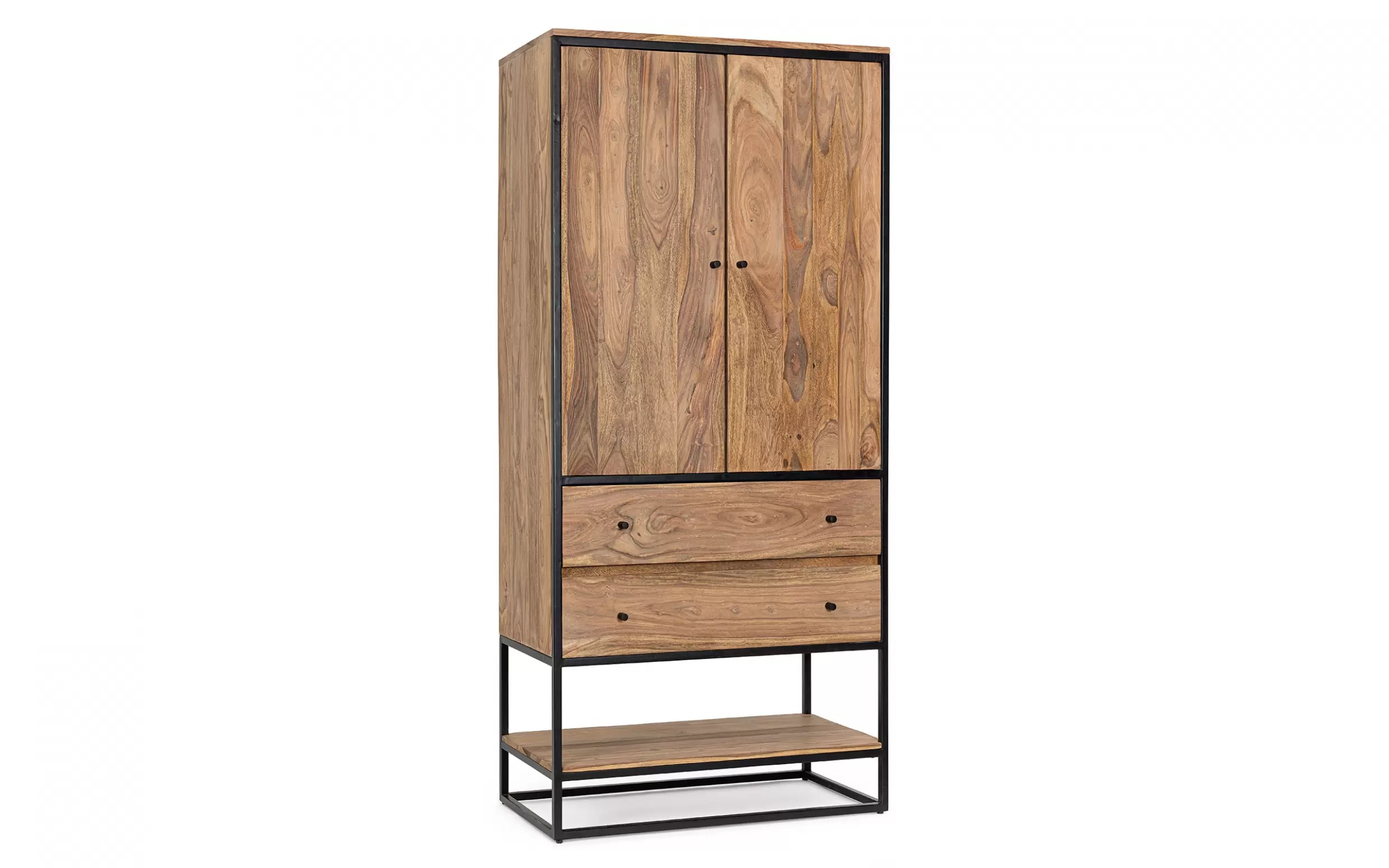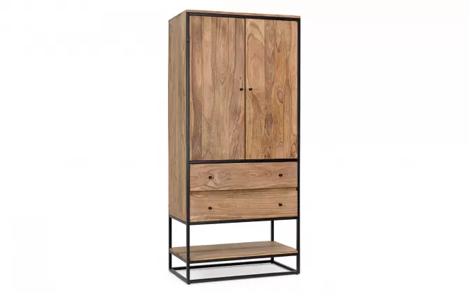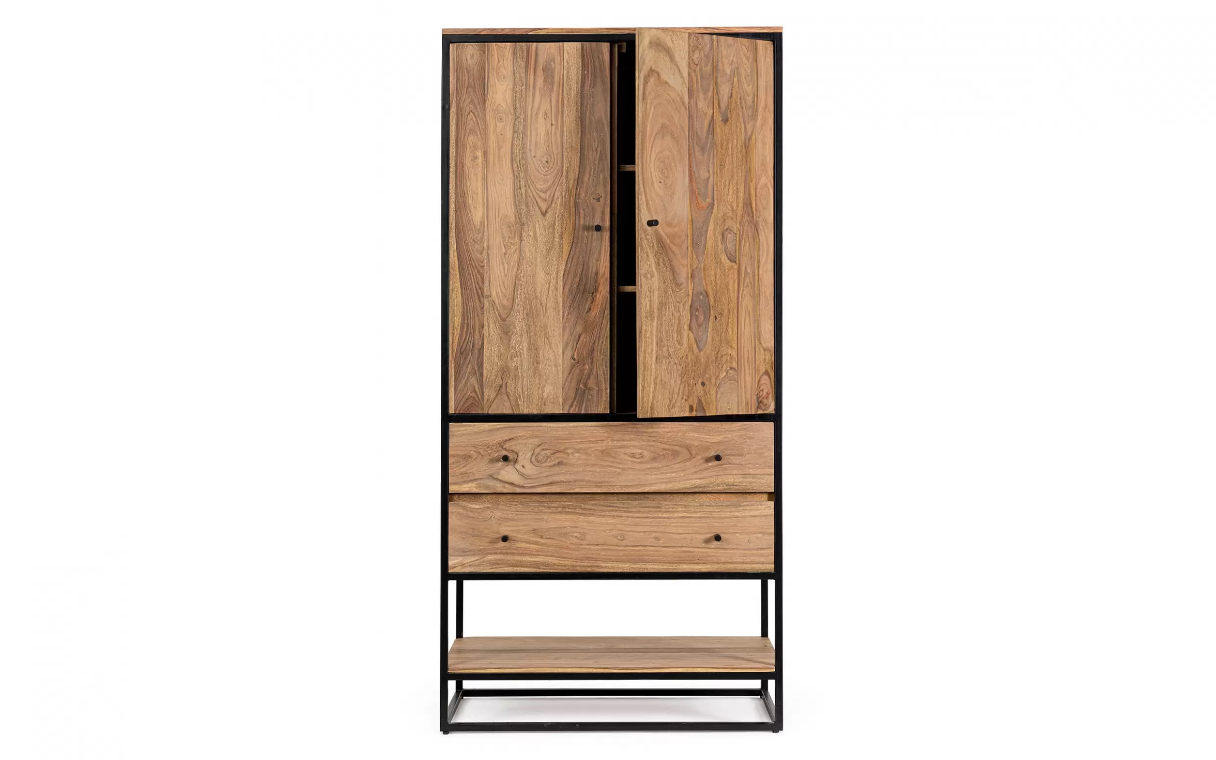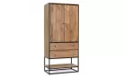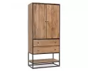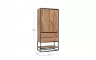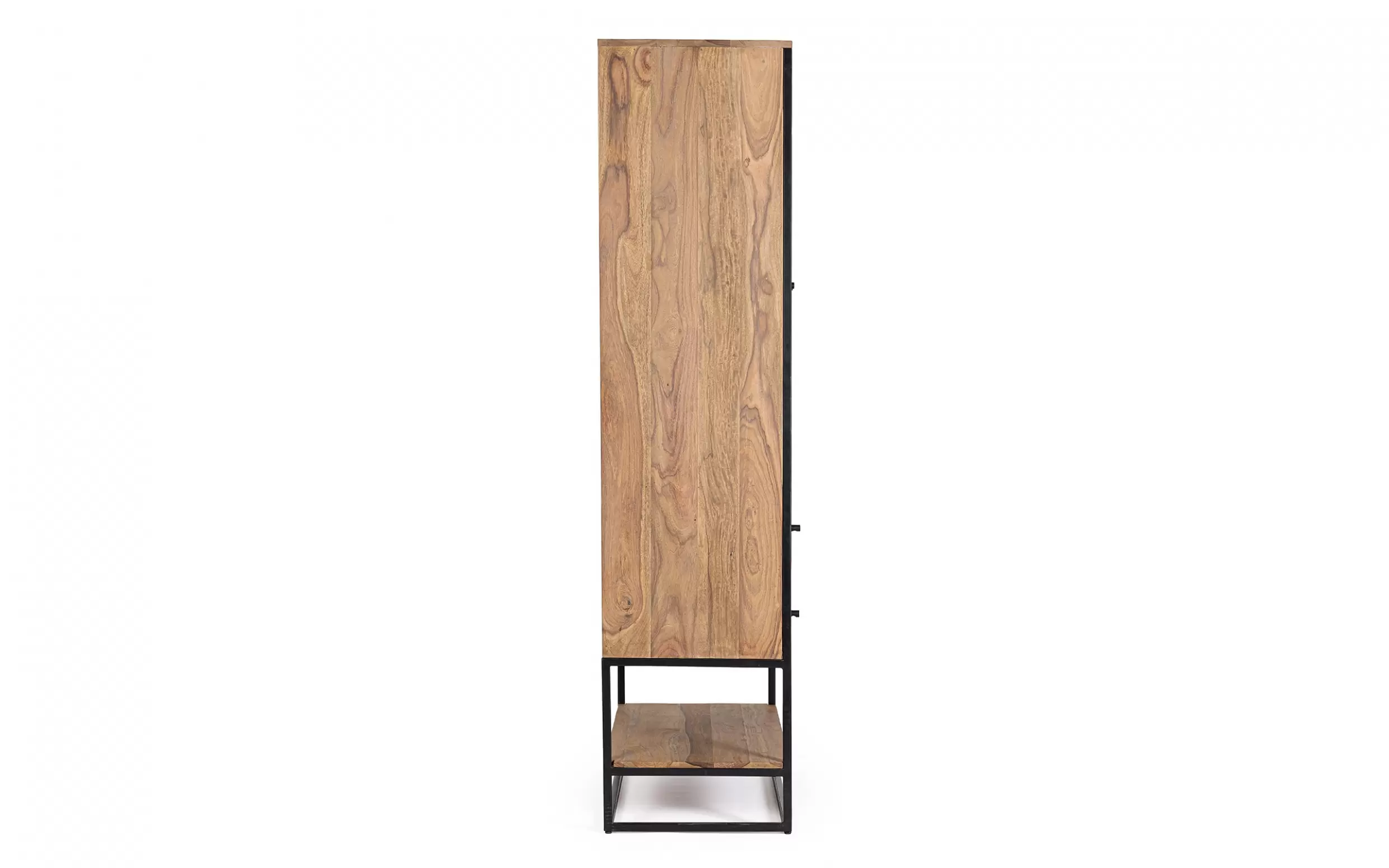 Witryna NARTAN 90×45×190 to połączenie naturalnego drewna sheesham z solidną stalą malowaną proszkowo. Mebel wykończony lakierem akrylowym ochronnym prezentuje się niezwykle stylowo, a przy tym jest trwały i odporny na codzienne użytkowanie. Fronty zdobią stalowe uchwyty, a wnętrze wyposażono w praktyczne półki i szuflady, co czyni go idealnym rozwiązaniem do przechowywania i ekspozycji.