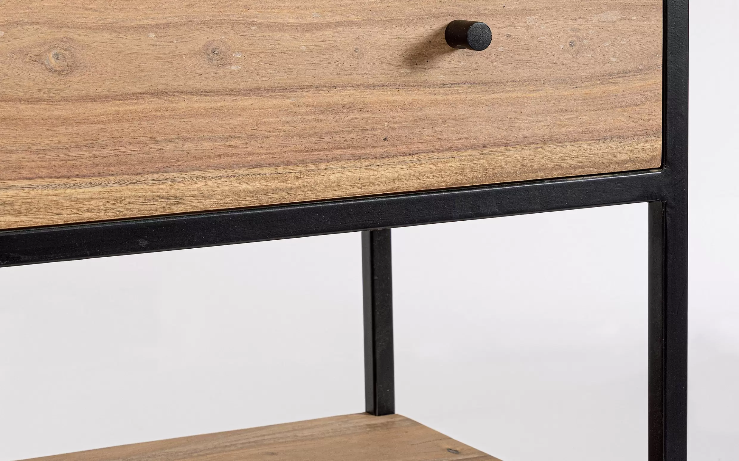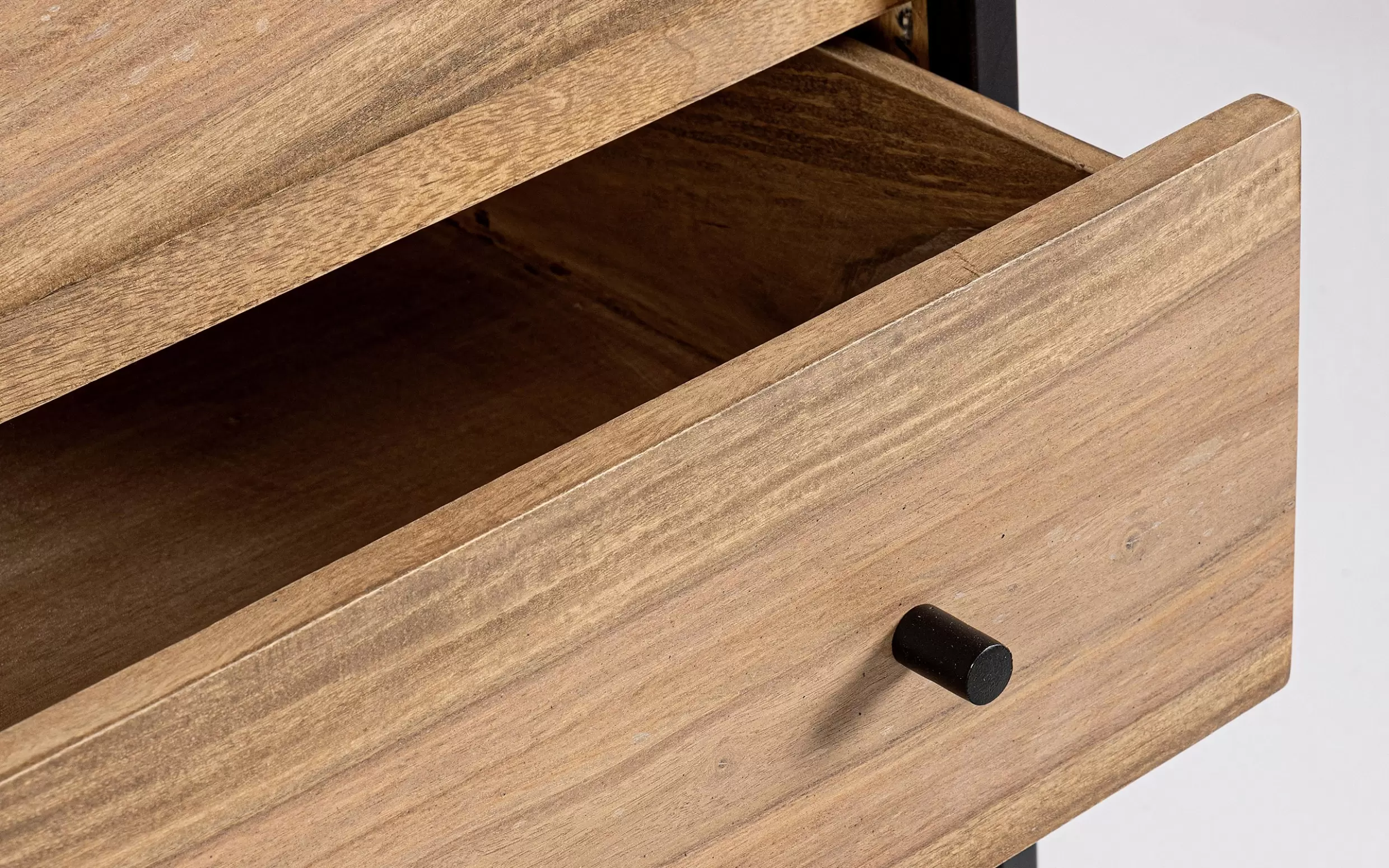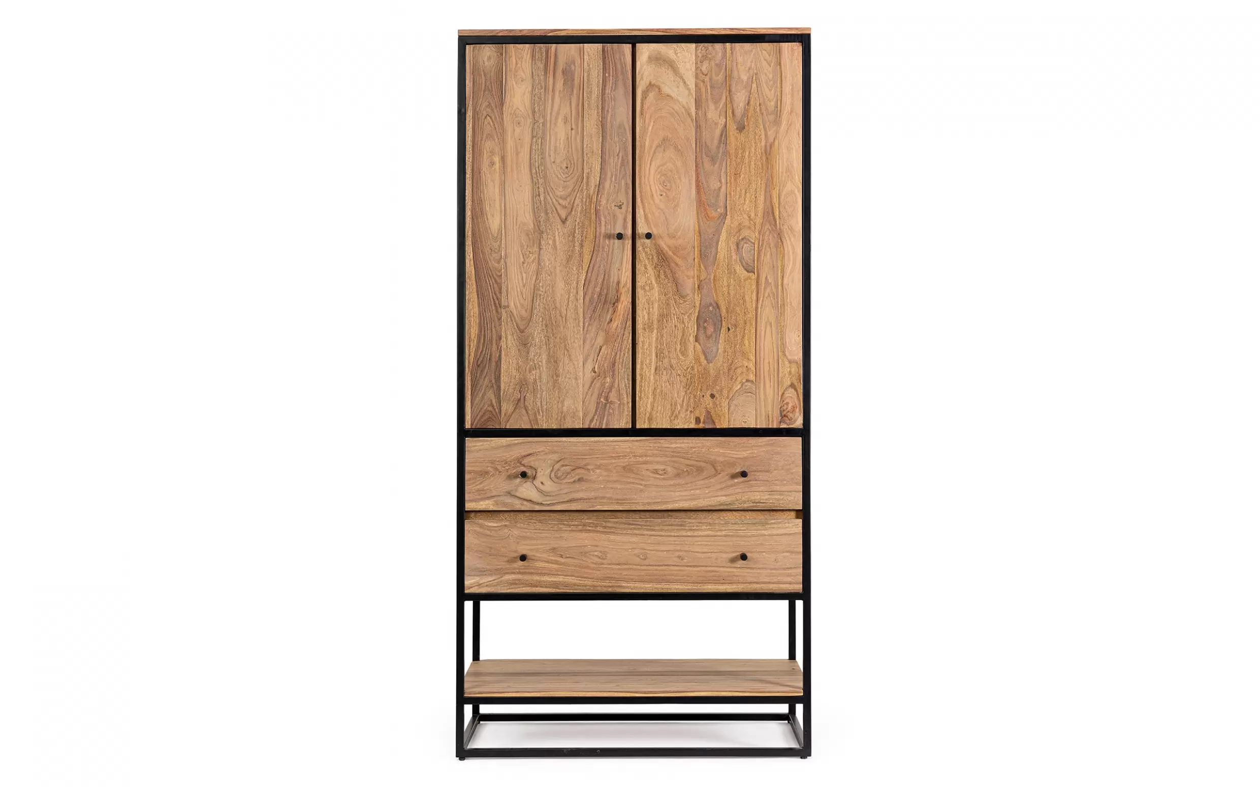 Witryna NARTAN 90×45×190 to połączenie naturalnego drewna sheesham z solidną stalą malowaną proszkowo. Mebel wykończony lakierem akrylowym ochronnym prezentuje się niezwykle stylowo, a przy tym jest trwały i odporny na codzienne użytkowanie. Fronty zdobią stalowe uchwyty, a wnętrze wyposażono w praktyczne półki i szuflady, co czyni go idealnym rozwiązaniem do przechowywania i ekspozycji.