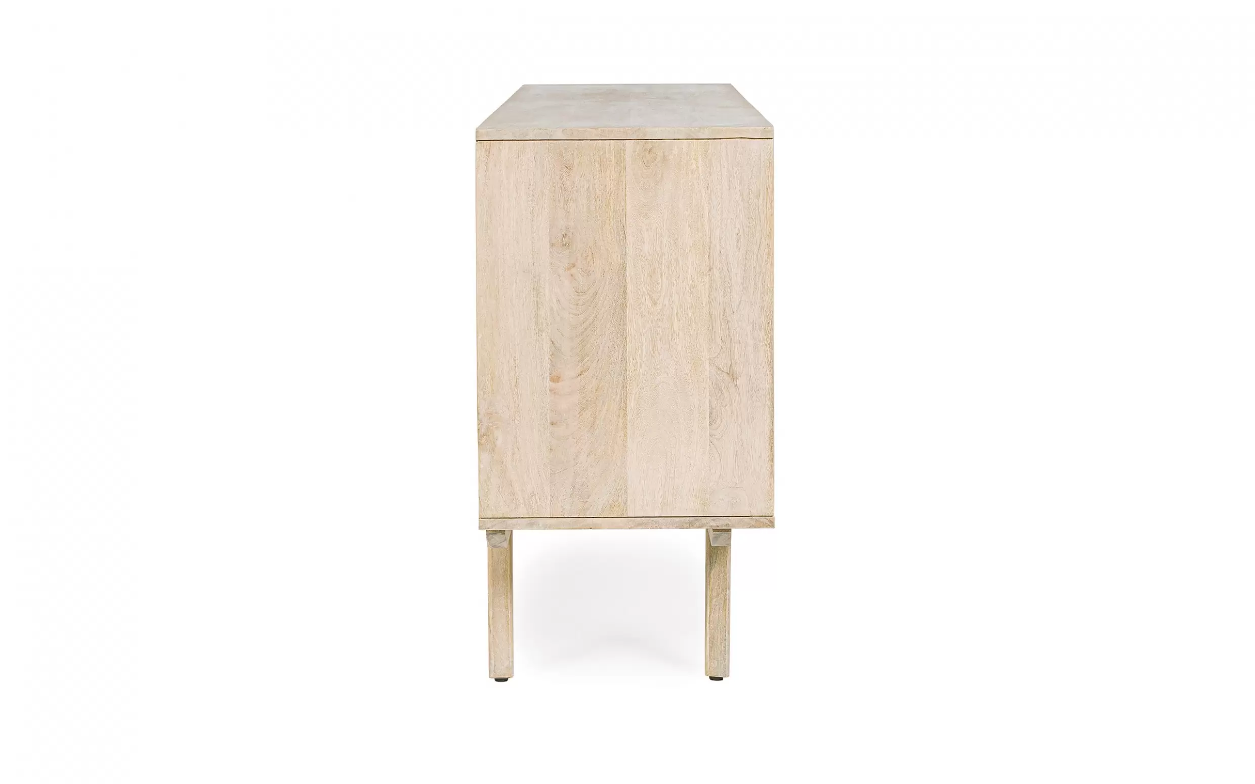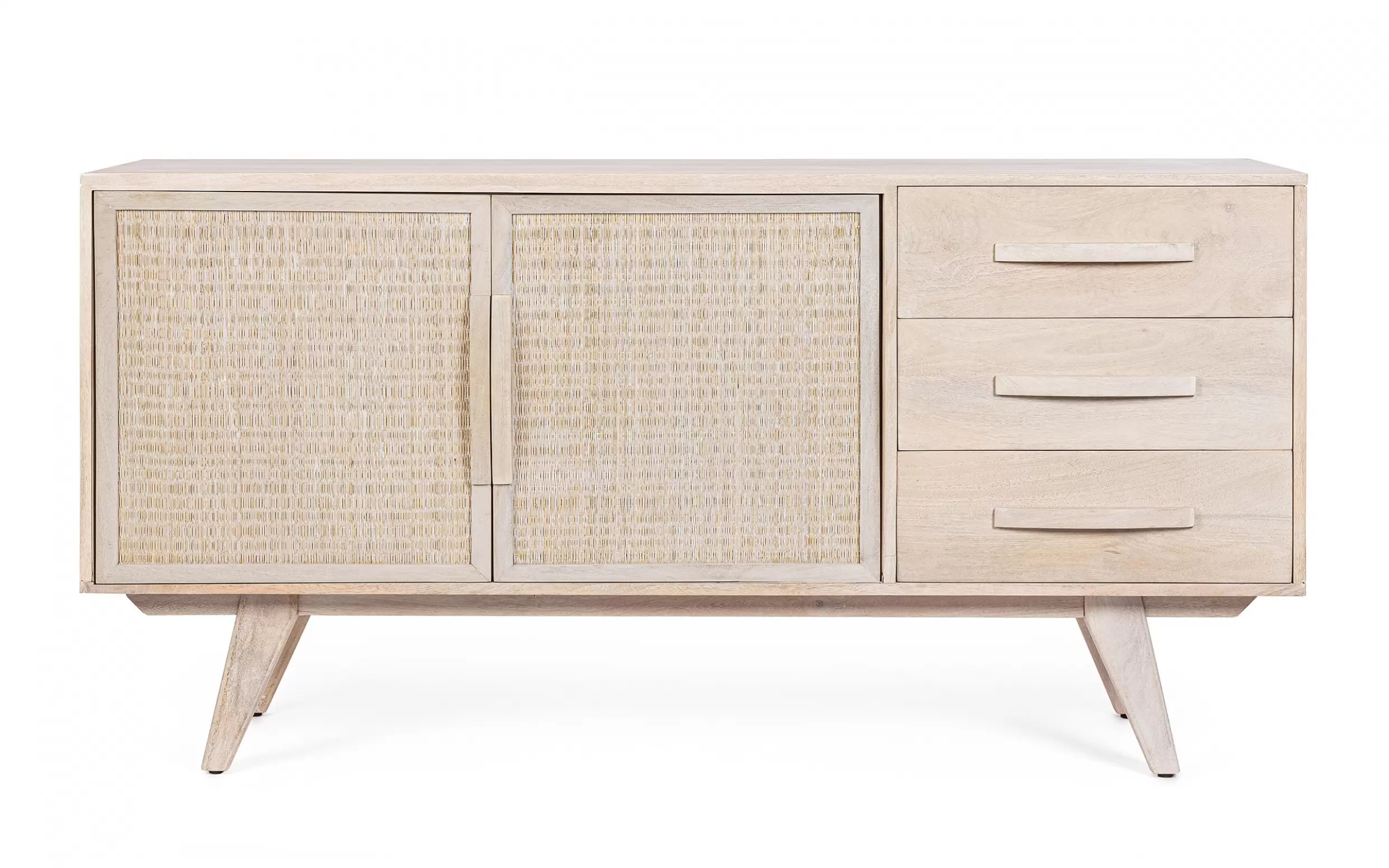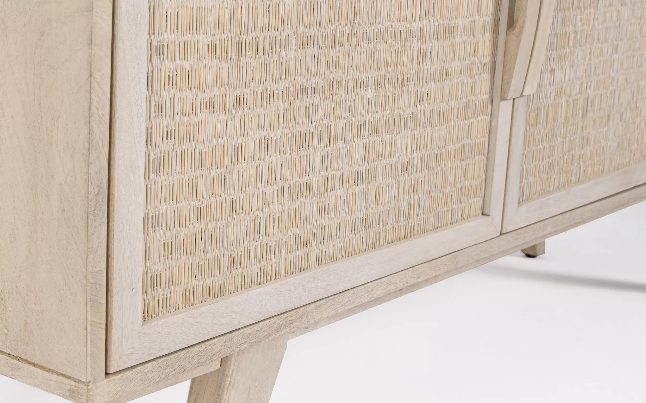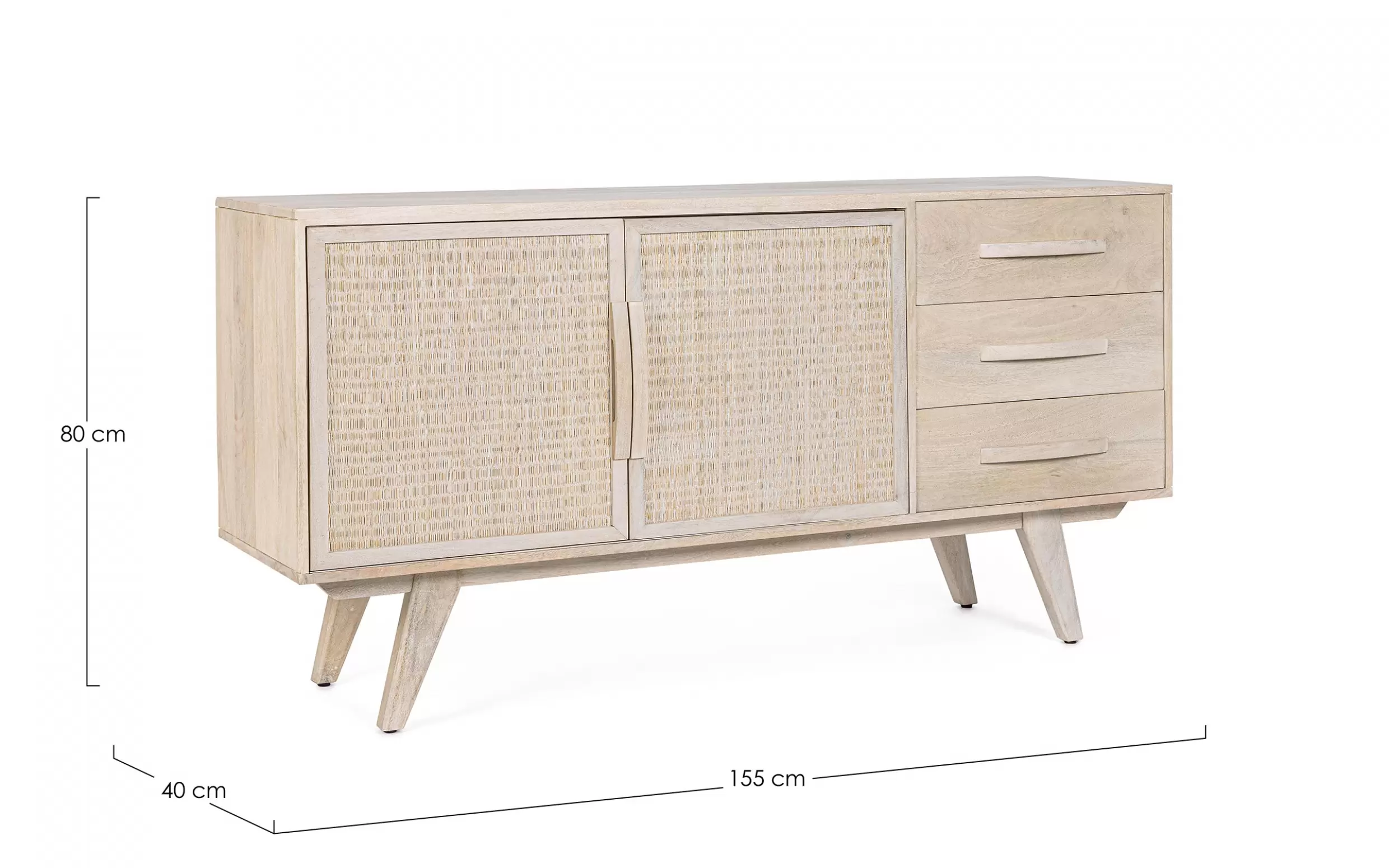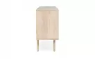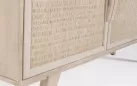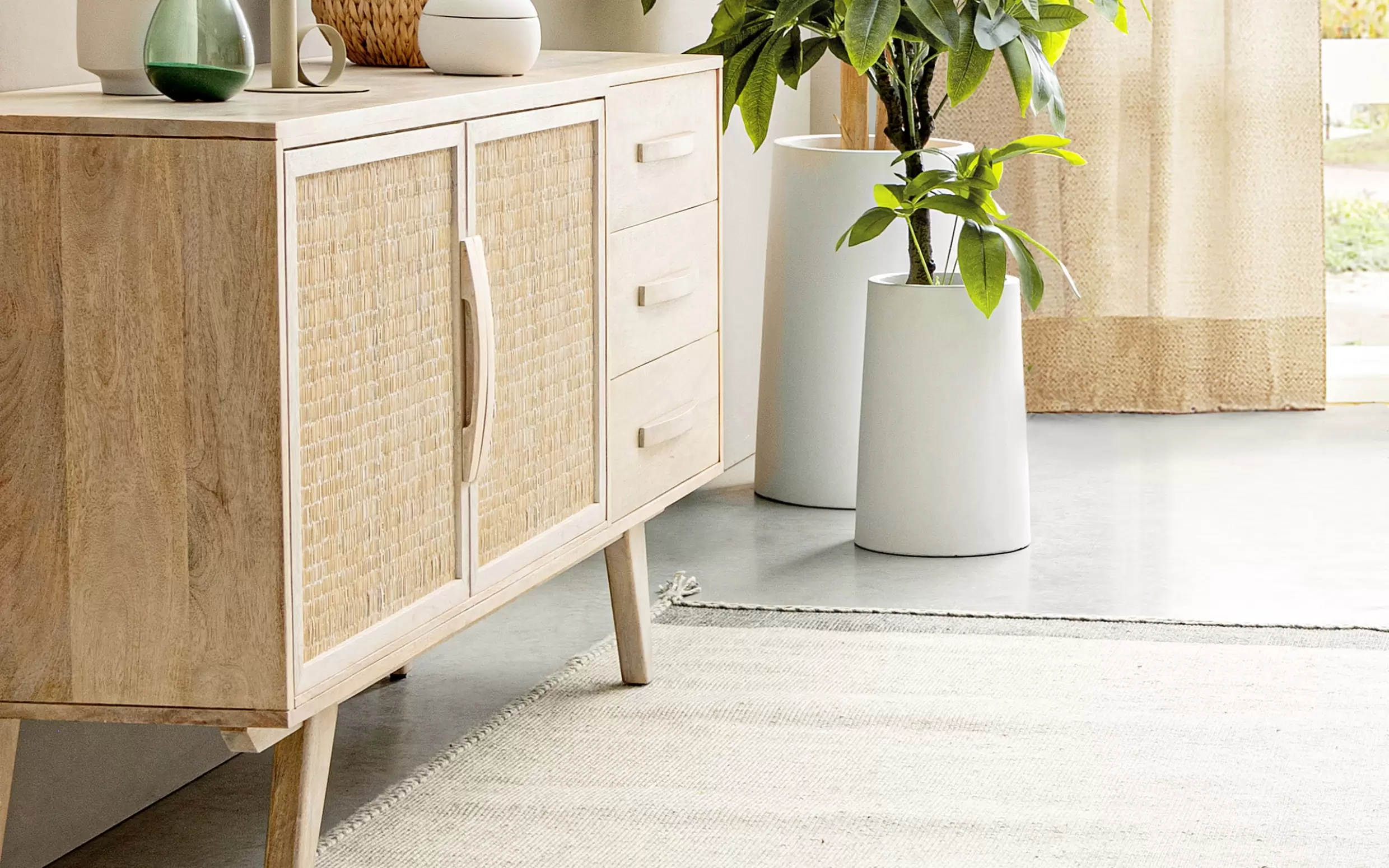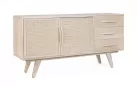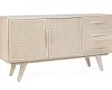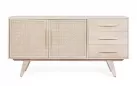 Komoda SAHANA to harmonijne połączenie naturalnego drewna mango i lekkiego rattanu. Fronty drzwi zdobią plecionki, a całość wykończono w odcieniu white wash, który dodaje świeżości. Plecy i dna szuflad wykonano z MDF, co zwiększa stabilność. Model oferuje 2 drzwi z wewnętrznymi półkami i 3 praktyczne szuflady, dzięki czemu świetnie sprawdzi się w salonie, jadalni lub sypialni urządzonych w stylu boho, skandynawskim czy naturalnym.