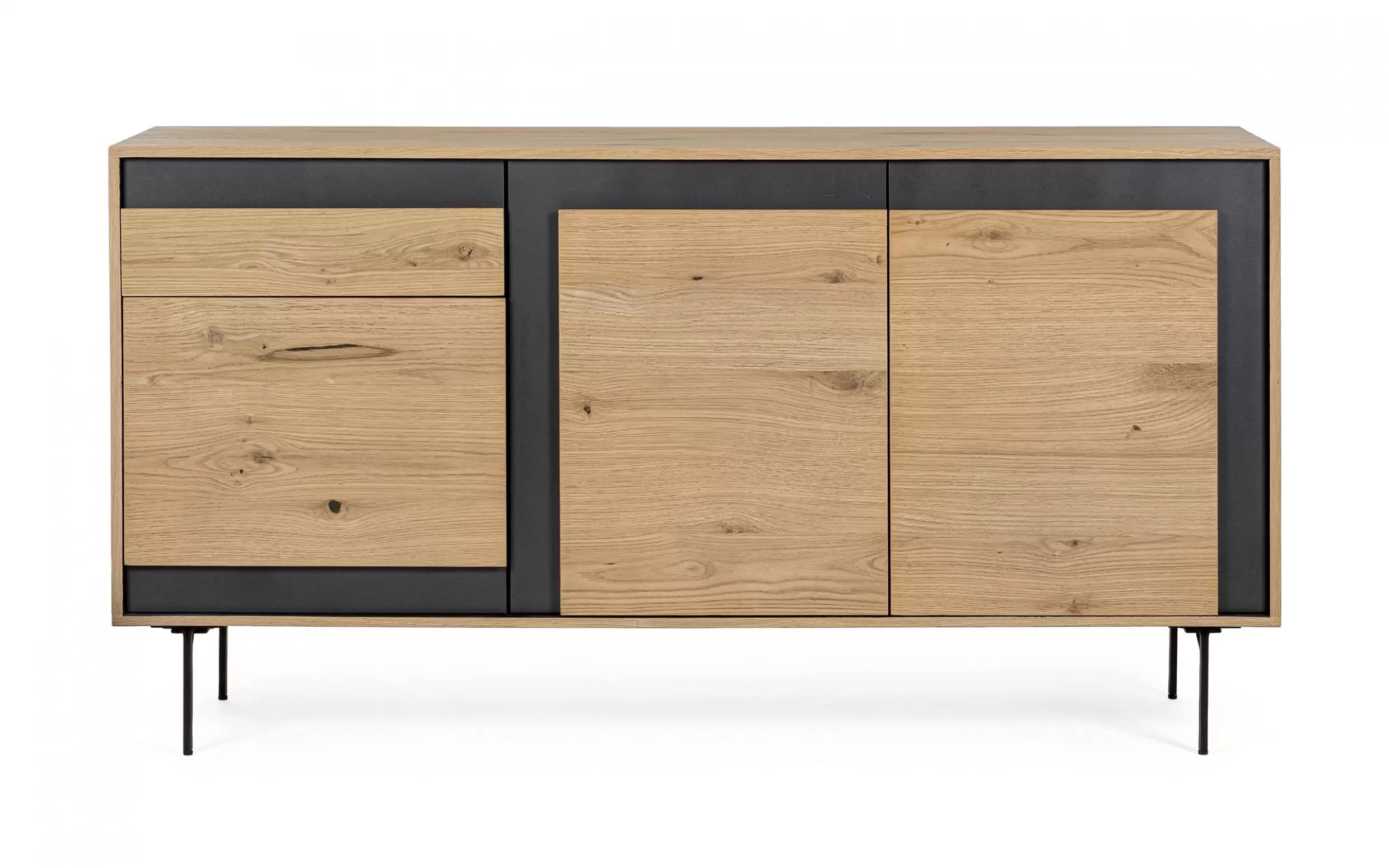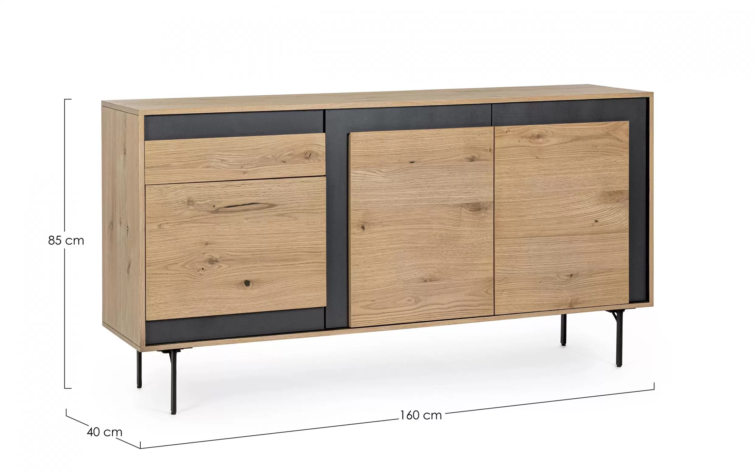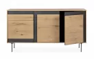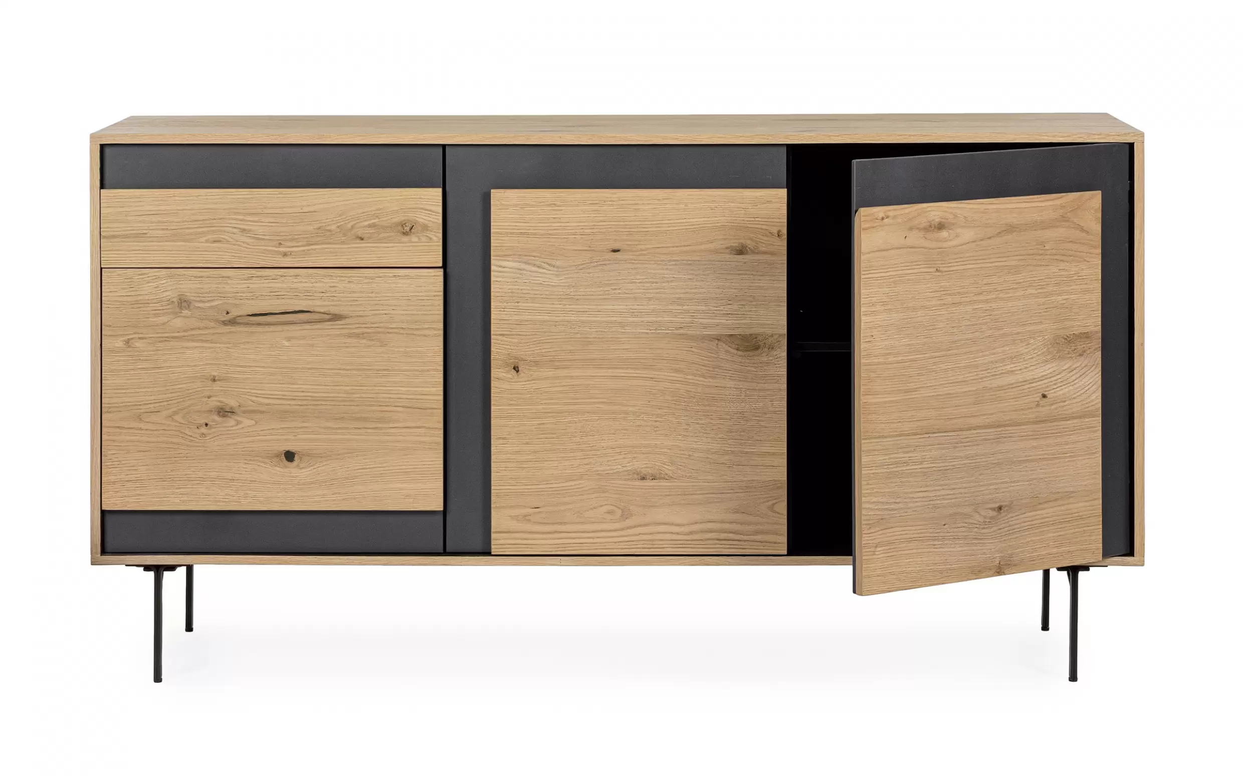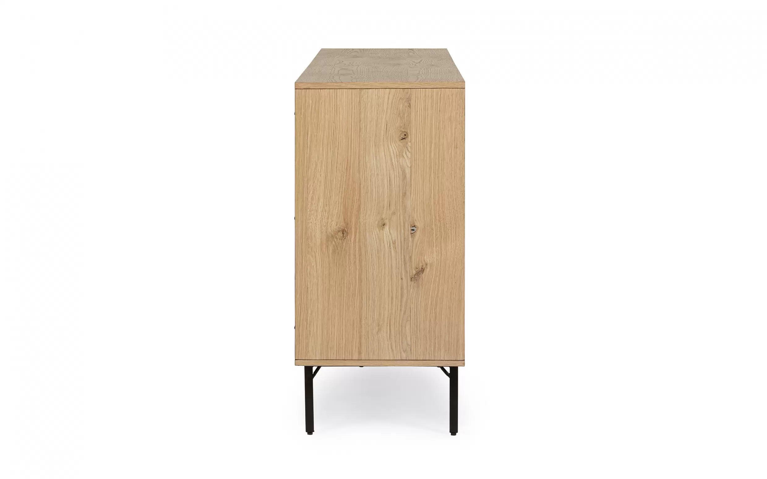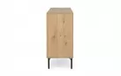 Komoda STANWOOD to elegancki i nowoczesny mebel, wykonany z MDF fornirowanego dębem i wykończony naturalnym lakierem wodnym. Stabilne stalowe nogi malowane proszkowo zapewniają trwałość i podkreślają współczesny design. Wnętrze szuflady w kolorze czarnym, osadzonej na stalowych prowadnicach, dodaje kontrastu i funkcjonalności. Model posiada 3 drzwi z wewnętrznymi półkami oraz 1 szufladę, oferując praktyczną przestrzeń do przechowywania w salonie, jadalni czy biurze.