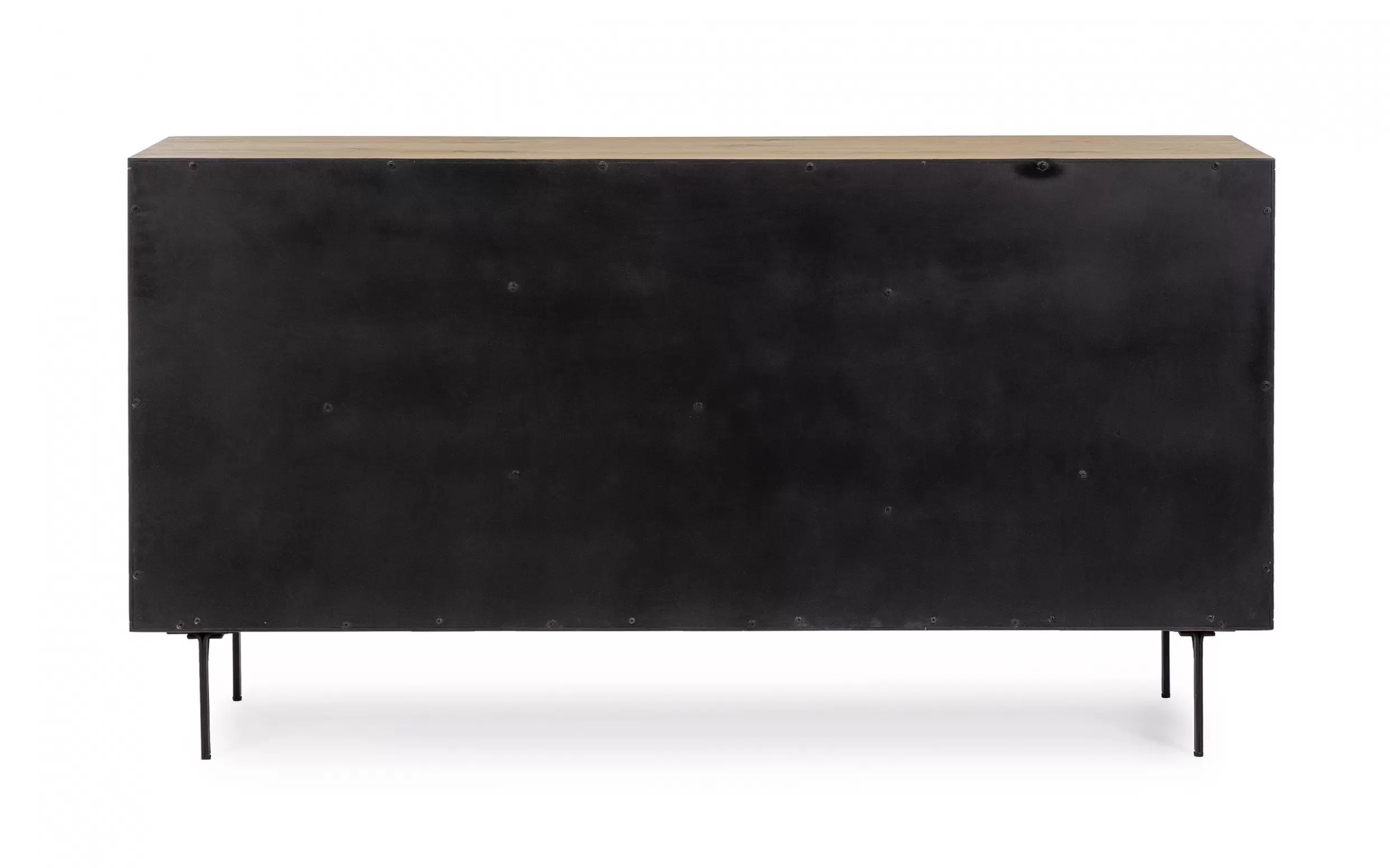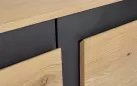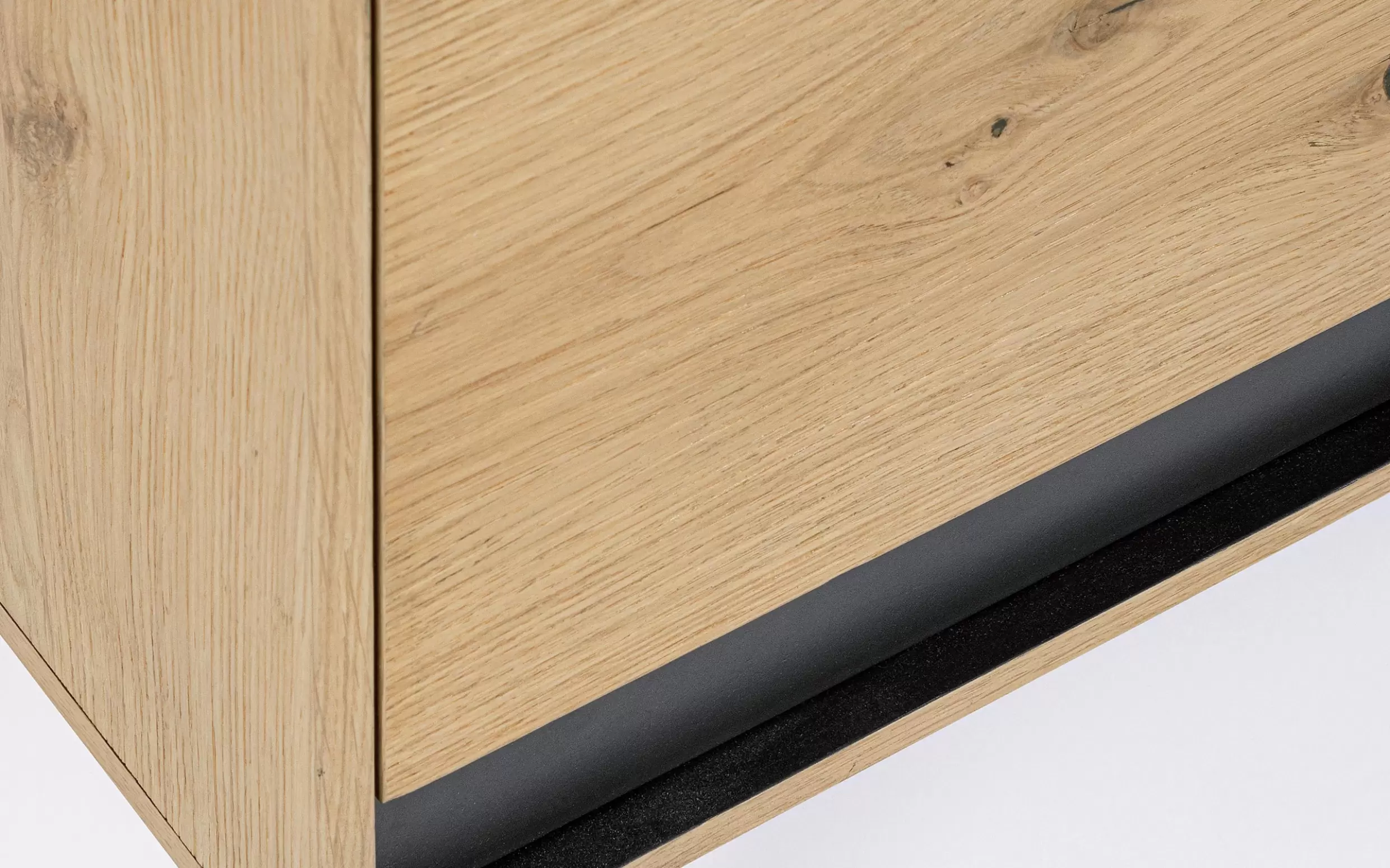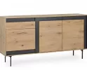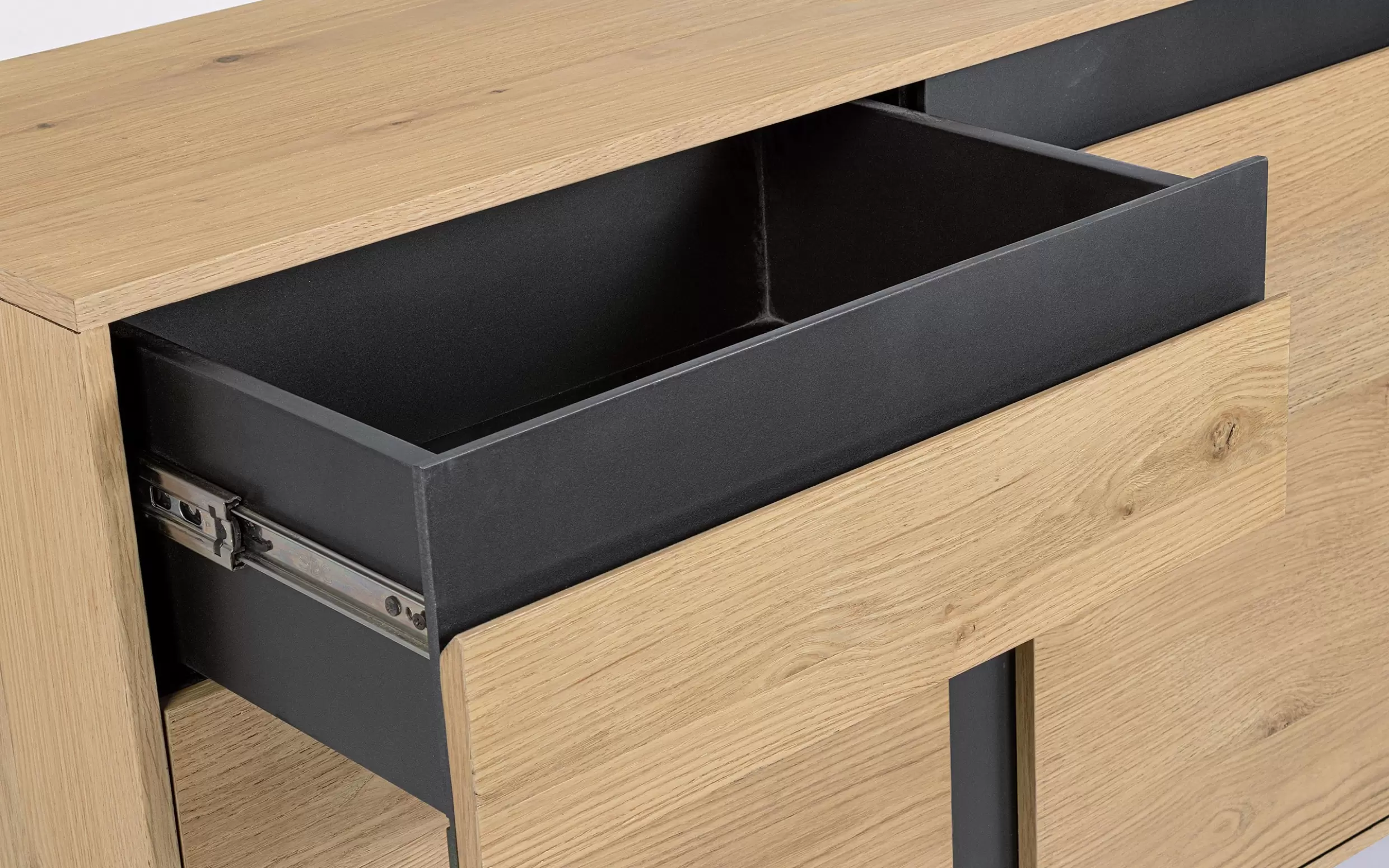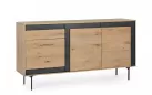 Komoda STANWOOD to elegancki i nowoczesny mebel, wykonany z MDF fornirowanego dębem i wykończony naturalnym lakierem wodnym. Stabilne stalowe nogi malowane proszkowo zapewniają trwałość i podkreślają współczesny design. Wnętrze szuflady w kolorze czarnym, osadzonej na stalowych prowadnicach, dodaje kontrastu i funkcjonalności. Model posiada 3 drzwi z wewnętrznymi półkami oraz 1 szufladę, oferując praktyczną przestrzeń do przechowywania w salonie, jadalni czy biurze.