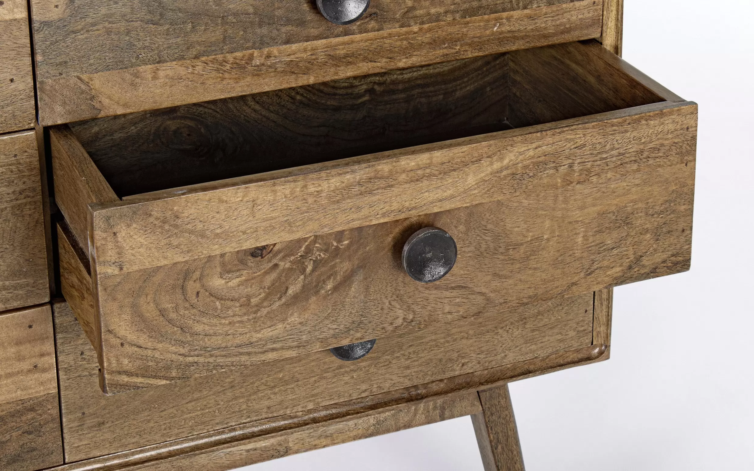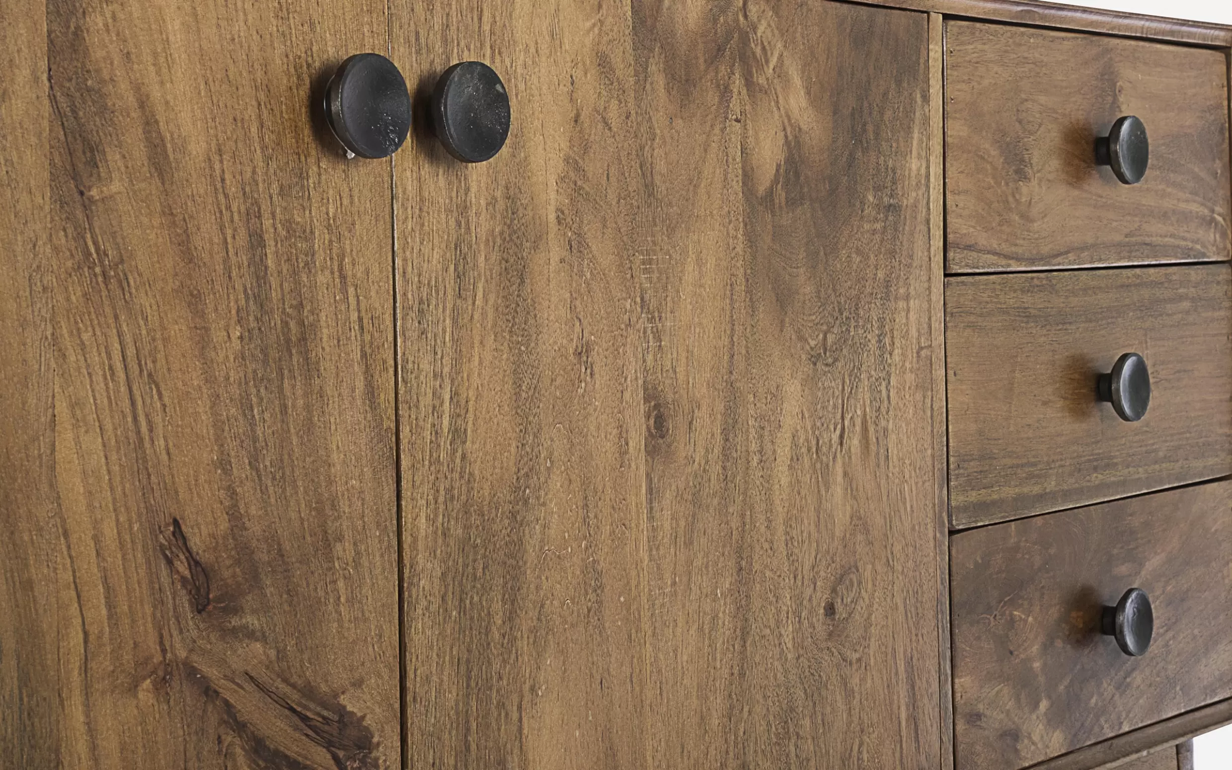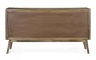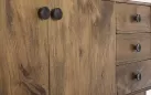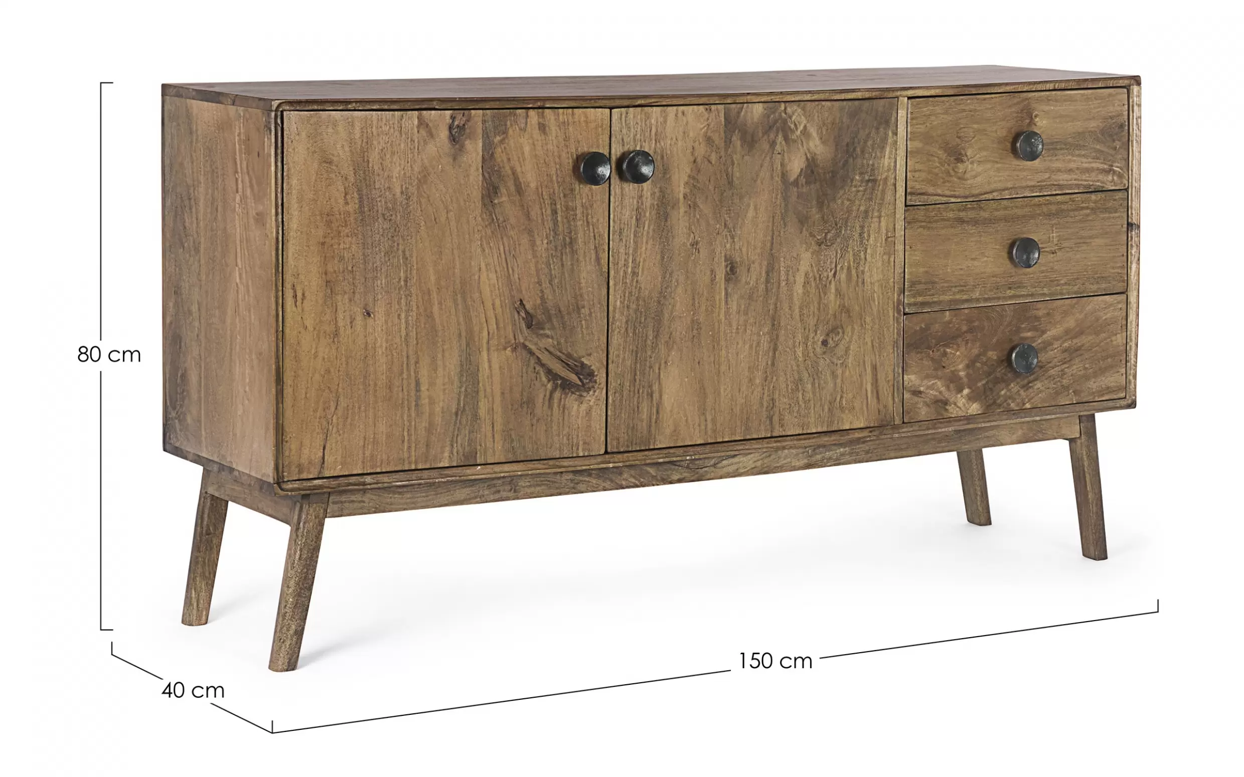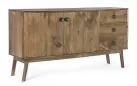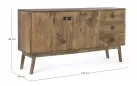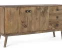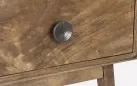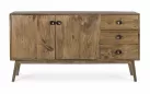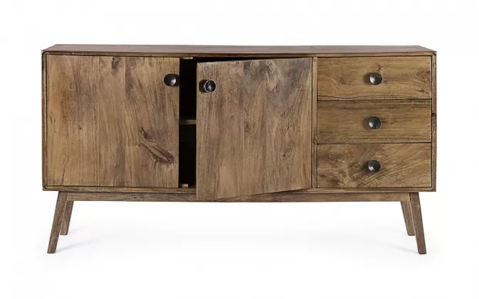 Komoda SYLVESTER to klasyczny mebel z nowoczesnym akcentem, wykonany z drewna mango. Wykończenie wodną farbą podkreśla naturalny charakter materiału, a stalowe gałki dodają elegancji. Solidna konstrukcja wsparta na nogach z tego samego drewna i plecach ze sklejki gwarantuje trwałość. Model oferuje 2 drzwi z półkami i 3 praktyczne szuflady, zapewniając funkcjonalne miejsce do przechowywania w salonie, jadalni czy gabinecie.
