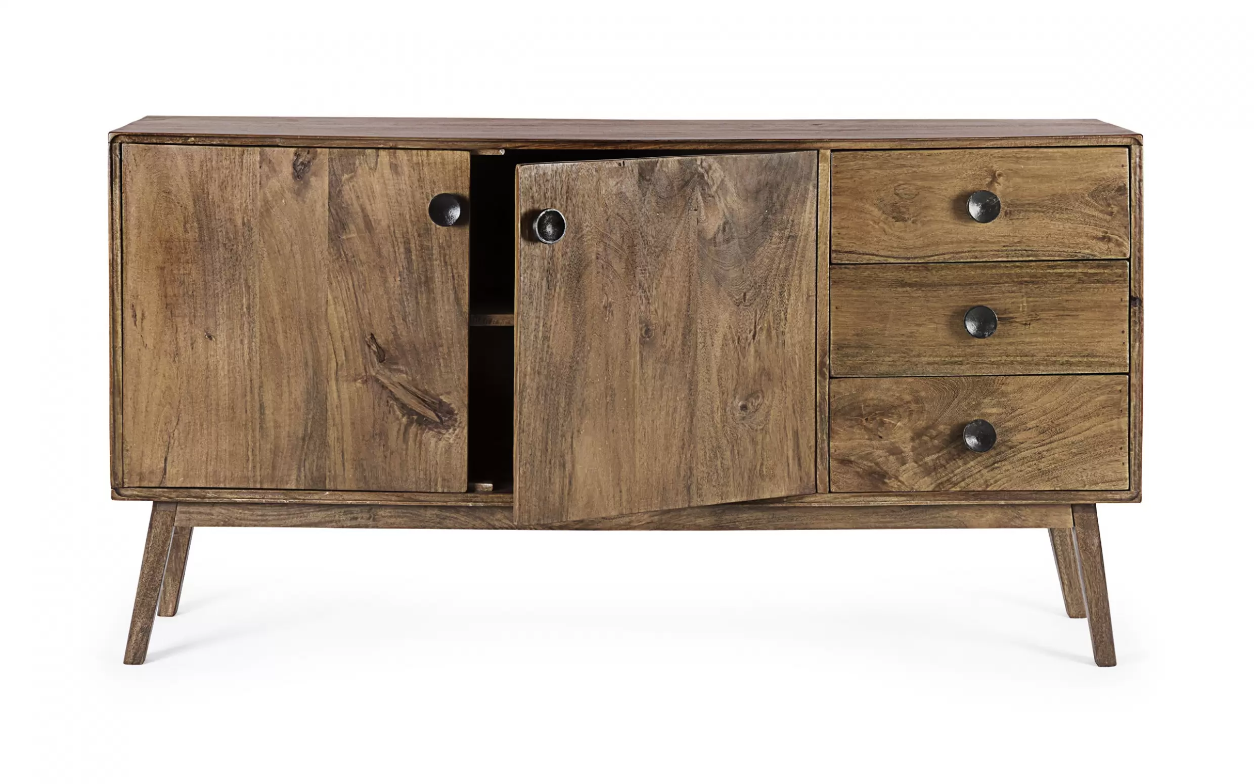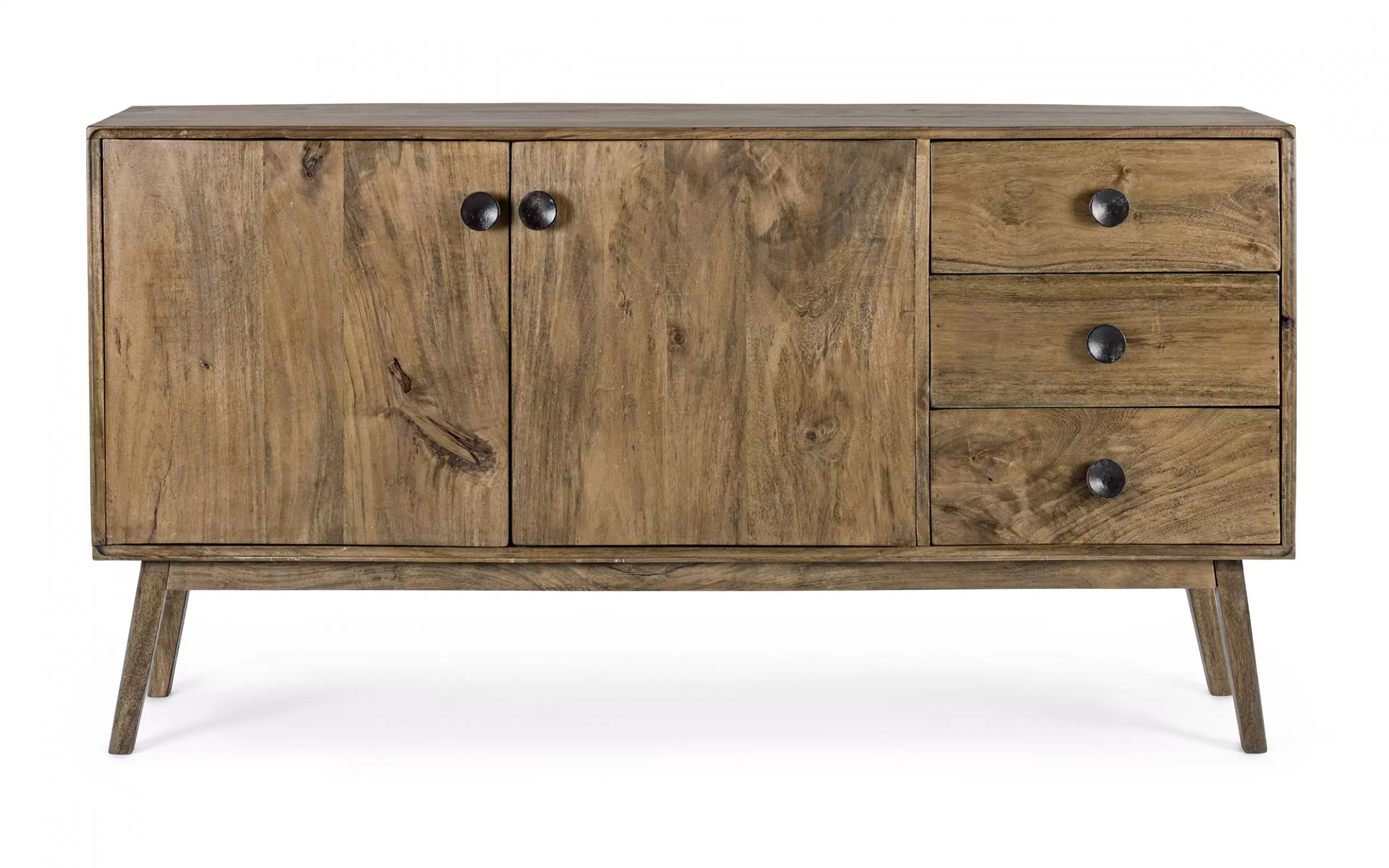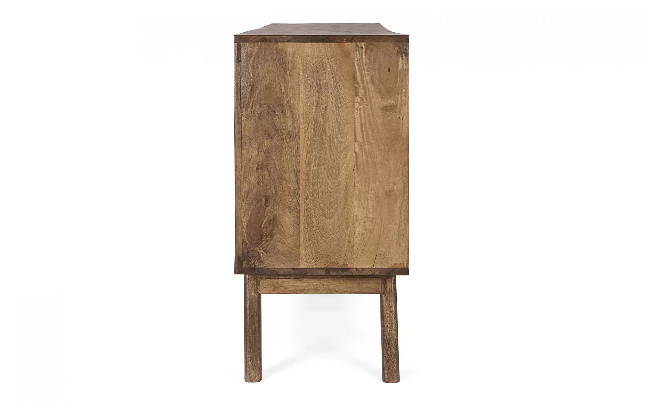 Komoda SYLVESTER to klasyczny mebel z nowoczesnym akcentem, wykonany z drewna mango. Wykończenie wodną farbą podkreśla naturalny charakter materiału, a stalowe gałki dodają elegancji. Solidna konstrukcja wsparta na nogach z tego samego drewna i plecach ze sklejki gwarantuje trwałość. Model oferuje 2 drzwi z półkami i 3 praktyczne szuflady, zapewniając funkcjonalne miejsce do przechowywania w salonie, jadalni czy gabinecie.