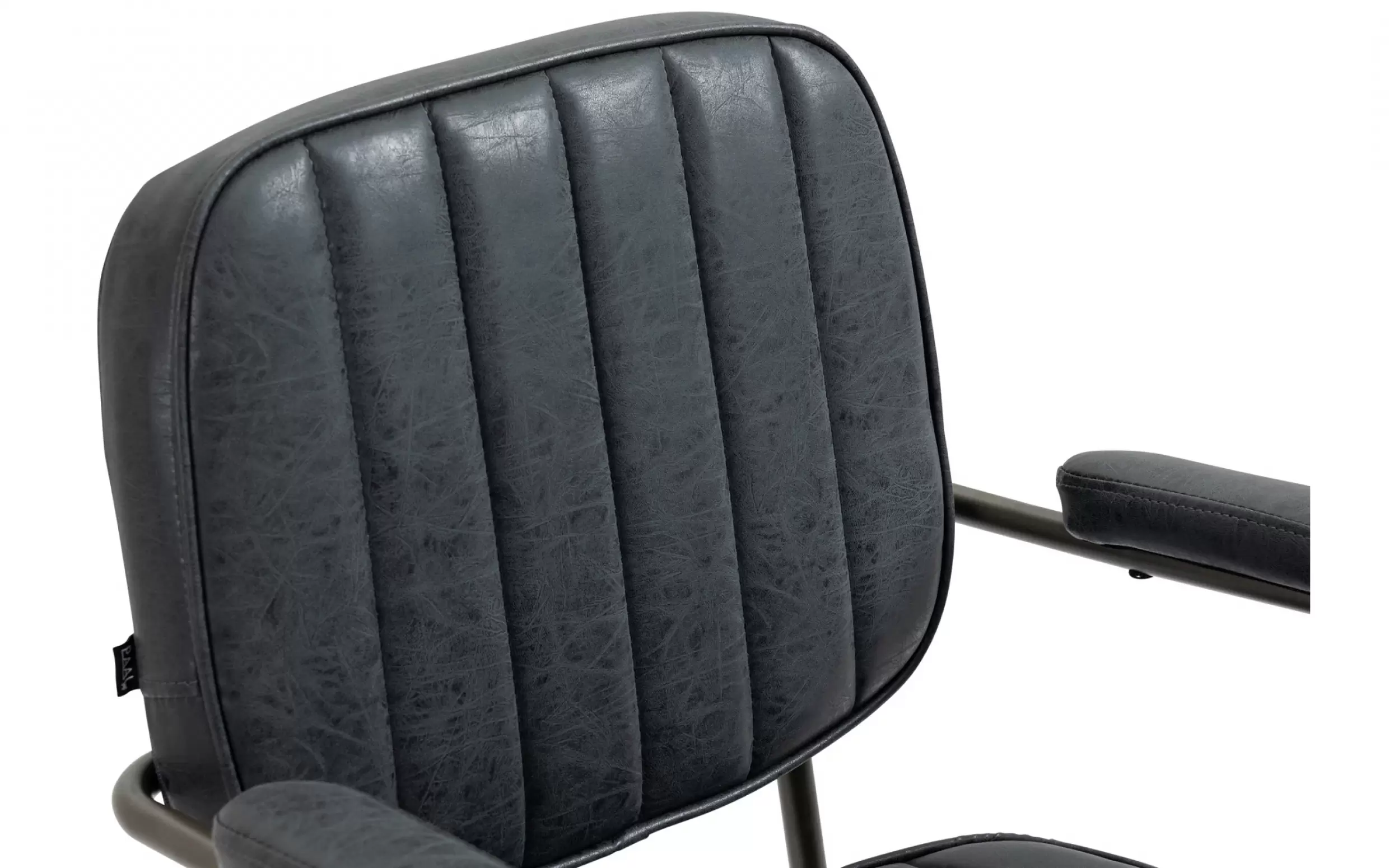 Elegancki fotel biurowy zachwyca charakterystycznym industrialnym wyglądem, jest też bardzo wygodny. Wytrzymałe obicie ze skóry syntetycznej i wysokiej jakości tapicerka zapewniają komfort siedzenia przez kilka godzin. Wysokie oparcie ma atrakcyjny kształt, a wysokość siedziska krzesła można płynnie regulować, co gwarantuje ergonomiczne siedzenie. Ponadto krzesło biurowe jest wyposażone w mechanizm kołyskowy, który zapewnia większą swobodę ruchów. Stabilność gwarantuje czarna metalowa podstawa. Dzięki pięciu płynnie toczącym się kółkom możesz łatwo i luźno toczyć się po podłodze – czy to na twardej, czy na wykładzinie.