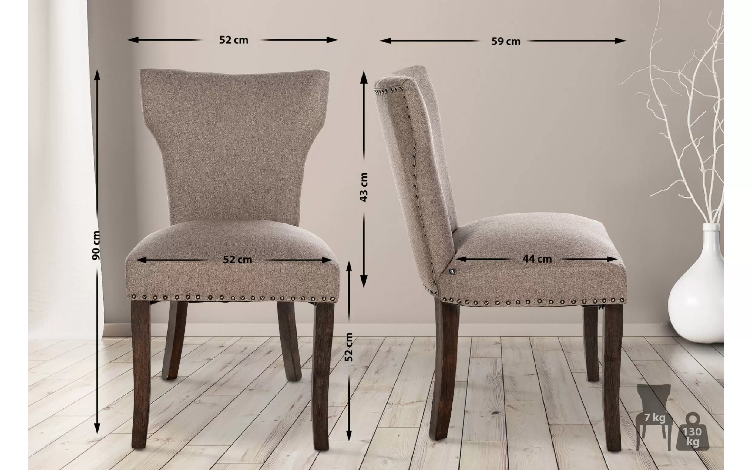 Materiałowe obicie o atrakcyjnym wyglądzie i subtelna dekoracja w postaci ćwieków nadają krzesłu ponadczasową elegancję, która podnosi walory każdego jadalni. Wszechstronnie użyteczne, krzesło w stylu klasycznym doskonale pasuje nie tylko do jadalni, ale także do innych pomieszczeń mieszkalnych i kuchni.