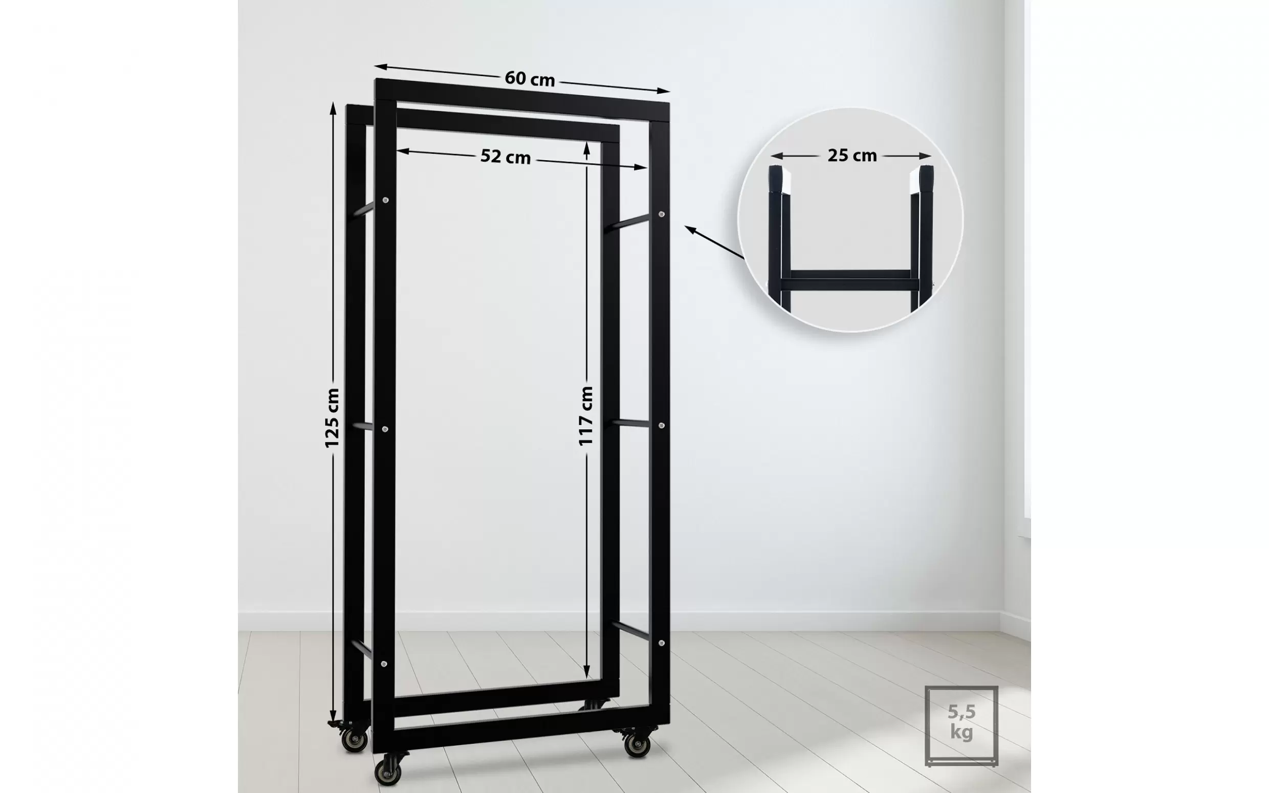 Dzięki prostemu wyglądowi stojak na drewno opałowe idealnie pasuje do nowoczesnych wnętrz. Oznacza to, że dobrze pasuje do salonu, ogrodu zimowego, sali kominkowej i przedpokoju, ale drewutnię na drewno opałowe można postawić także w garażu czy piwnicy.