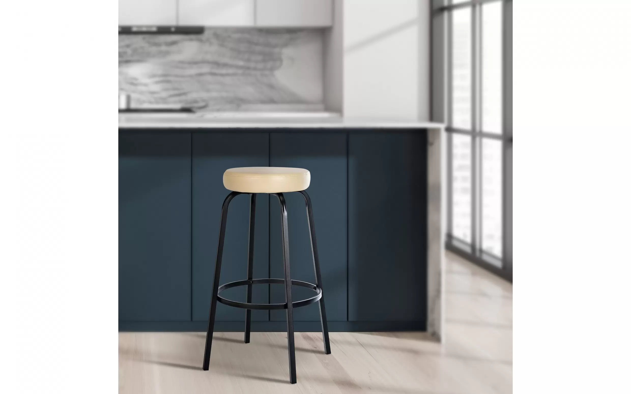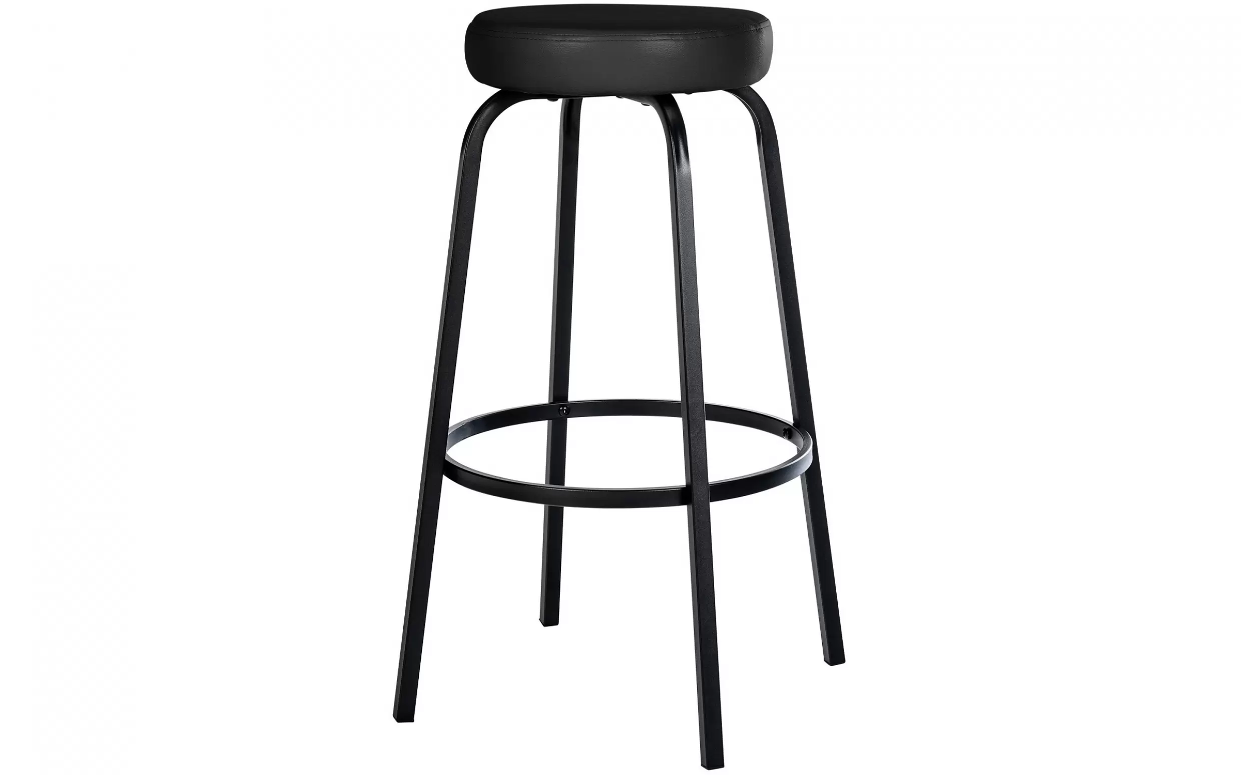 Stołek stoi na podstawie na czterech nogach z matowego czarnego metalu. Ta konstrukcja jest stabilna i bardzo przyjazna dla podłóg, dzięki czemu nie uszkadza delikatnych powierzchni. Poprzeczki w konstrukcji mogą być wykorzystywane jako wygodny podnóżek.
