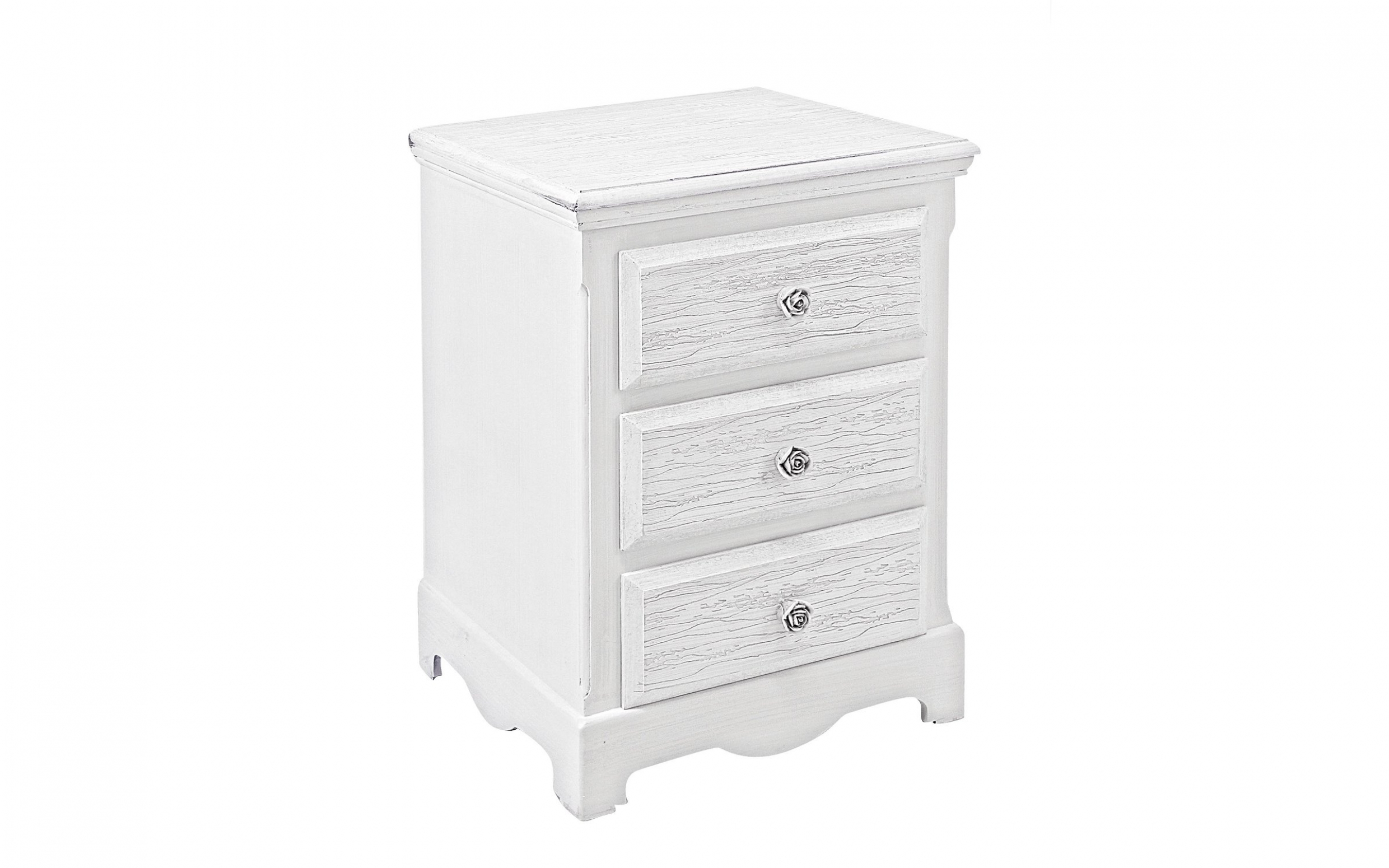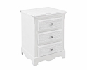 Komoda BLANC 3DR to praktyczny mebel w kompaktowym formacie. Wykonana z MDF w matowym białym wykończeniu z efektem bielenia. Wyposażona w 3 szuflady z ozdobnymi uchwytami z poliresinu. Niewielka wysokość 63,5 cm czyni ją idealną do sypialni lub pokoju dziecięcego.